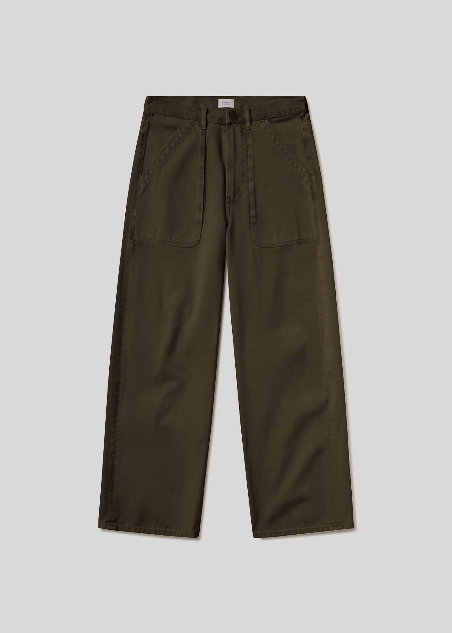 Meet the Ayla Cargo Crop Jean by Citizens of Humanity in a chic dark olive shade, perfect for a minimalist spring look. Crafted from 100% regenerative cotton, this high-rise jean features a relaxed fit and wide leg style, complete with essential front utility pockets. With a rise of 12 inches and an inseam of 26.5 inches, it closes with a convenient zip fly and is made in Turkey. Care for these jeans is effortless—simply machine wash cold inside out with like colors and tumble dry low. Model is 5'10" and is wearing a size 27.