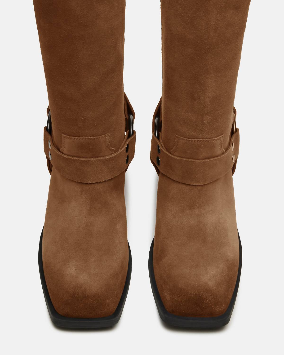 A stylish boot with a comfortable fit and the perfect amount of height. These classic boots are the perfect addition to any outfit and can be worn season after season. Introducing the Women's Ruskin Suede Boots by Steve Madden, a chic blend of fashion and function. These chestnut-colored, knee-high boots feature a squared toe and block heel for a sophisticated Western-inspired look. Crafted from durable suede, they boast buckle details with rings, ideal for your fall wardrobe and Halloween festivities. The low heel height of 6 cm ensures comfort and style, making them a must-have for your next vacation.