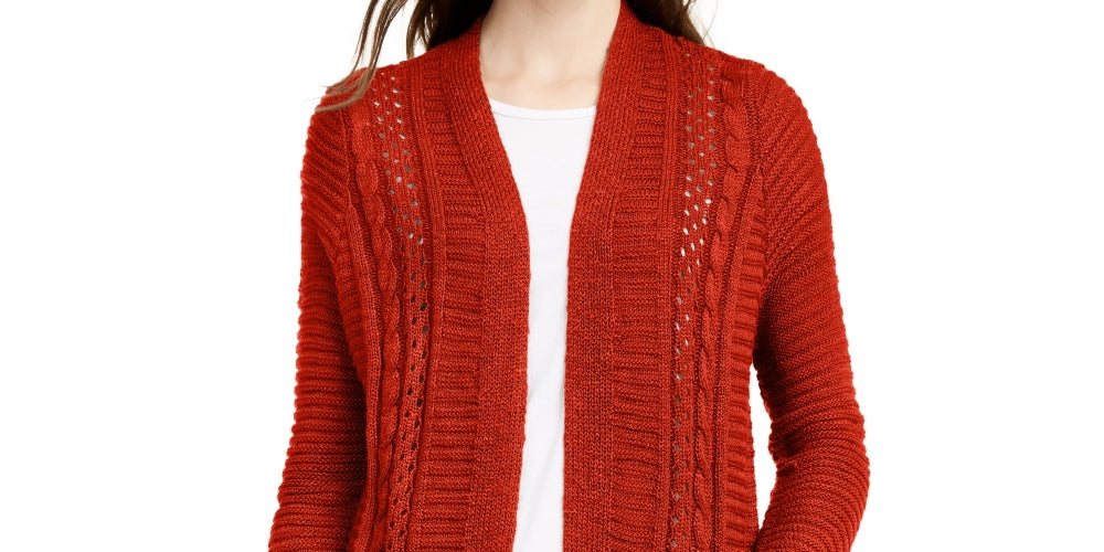 Relaxed fit|Open front with no closure|Mixed knits with eyelet detail; two patch pockets|Runs Small; we suggest sizing up for the perfect fit|Acrylic/cotton