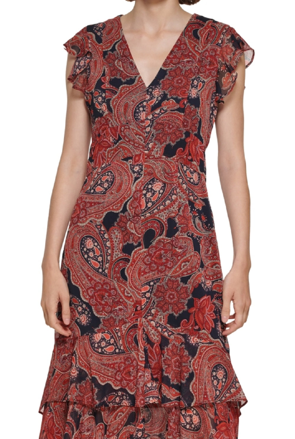 Make an impression in Tommy Hilfiger's elegant flutter-sleeve paisley dress| styled with ruffles along the high-low hem.| Approx. 50 long from center back neck to hem. Length is based on size 6 and varies 1/4 between sizes| Runs true to size; order your normal size| Falls below the knee to lower calf| Chiffon; Smooth| sheer woven fabric
