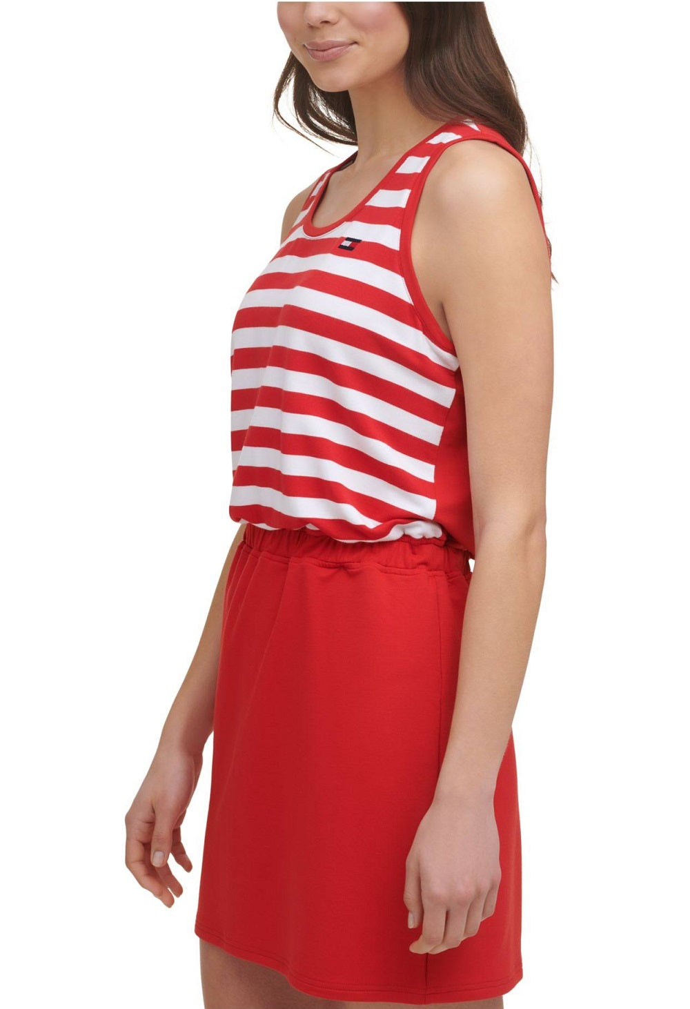 Choose a sporty casual look with this Tommy Hilfiger Sport tank dress featuring a classic striped front and a cinched elastic waist.| Stretch baby terry fabric| Scoop neckline; striped at front bodice; cinched elastic waist; logo at chest| | Polyester/rayon/elastane| Machine washable| Imported