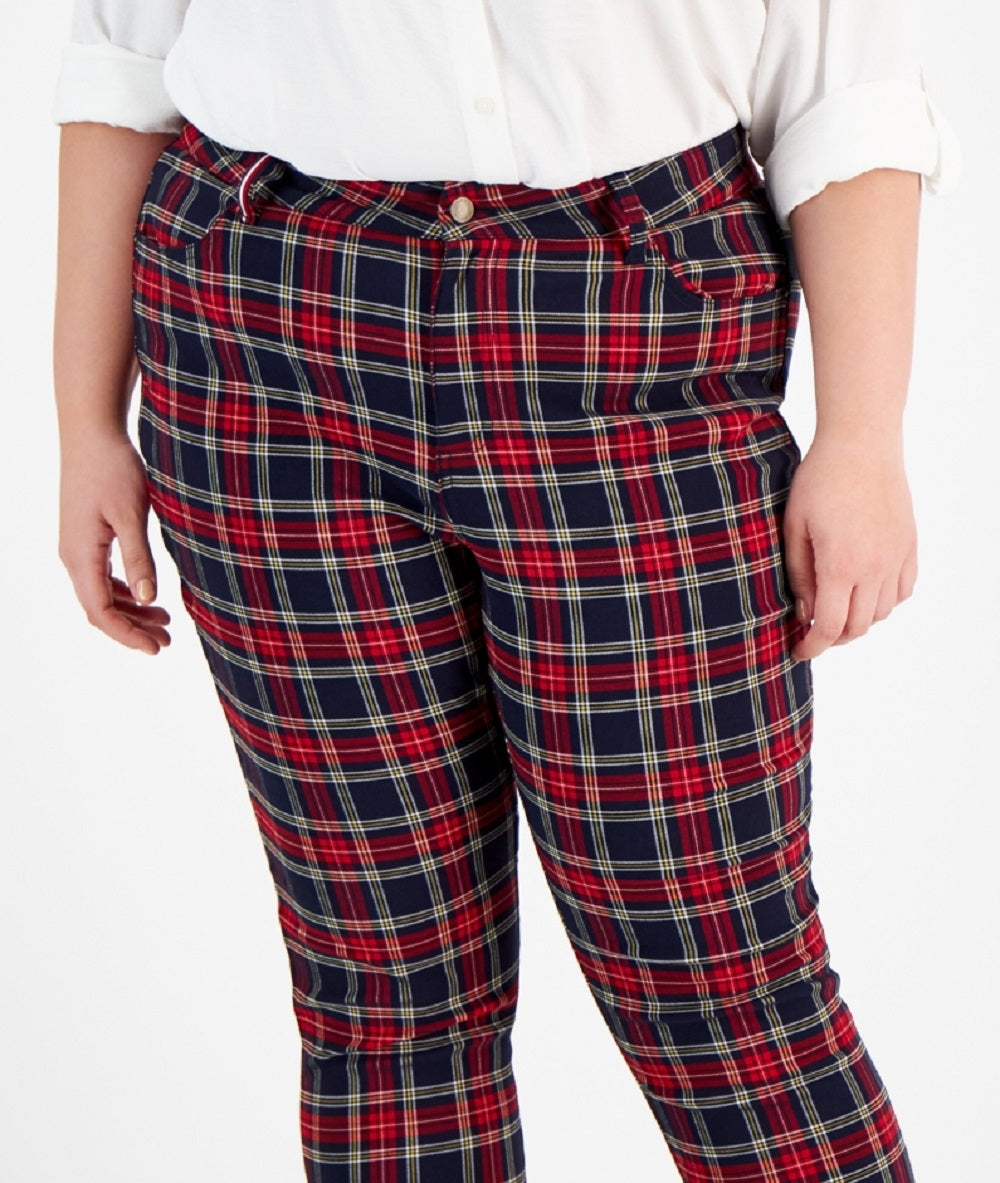 The sporty-meets-sophisticated pant your everyday wardrobe needs. This skinny style from Tommy Hilfiger features a bold print and just the right amount of stretch for getting around comfortably.| Approx. inseam; 27| Front rise; approx. 12; back rise; approx. 19-1/2| Front button closure| Plaid print; belt loops| Rayon/polyester/spandex| Machine washable