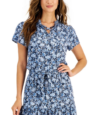 Tommy Hilfiger Women's Floral Printed Tie Neck Dress Blue Size Medium