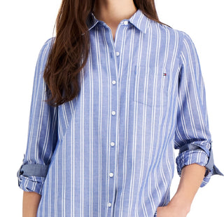 Tommy Hilfiger Women's Striped Roll Tab Shirt Blue Size XX Large