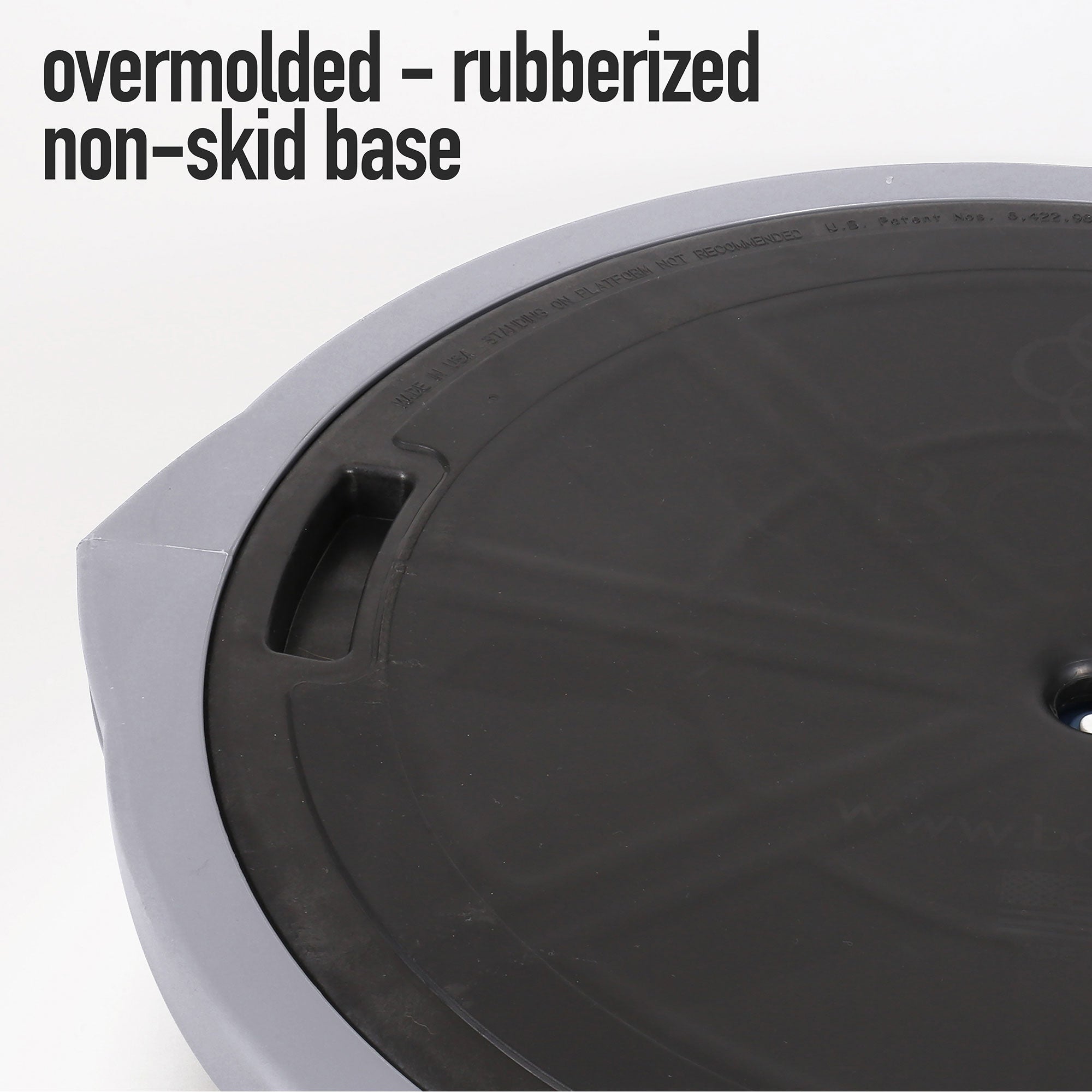 The Bosu Pro NexGen Balance Trainer has an over-molded rubberized base that will stay firmly in place so you can use the inflatable surface of the Bosu trainer. The quadrant design on the Bosu trainer's surface helps you precisely position your hands or feet while exercising, improving your ability to target certain muscle groups.