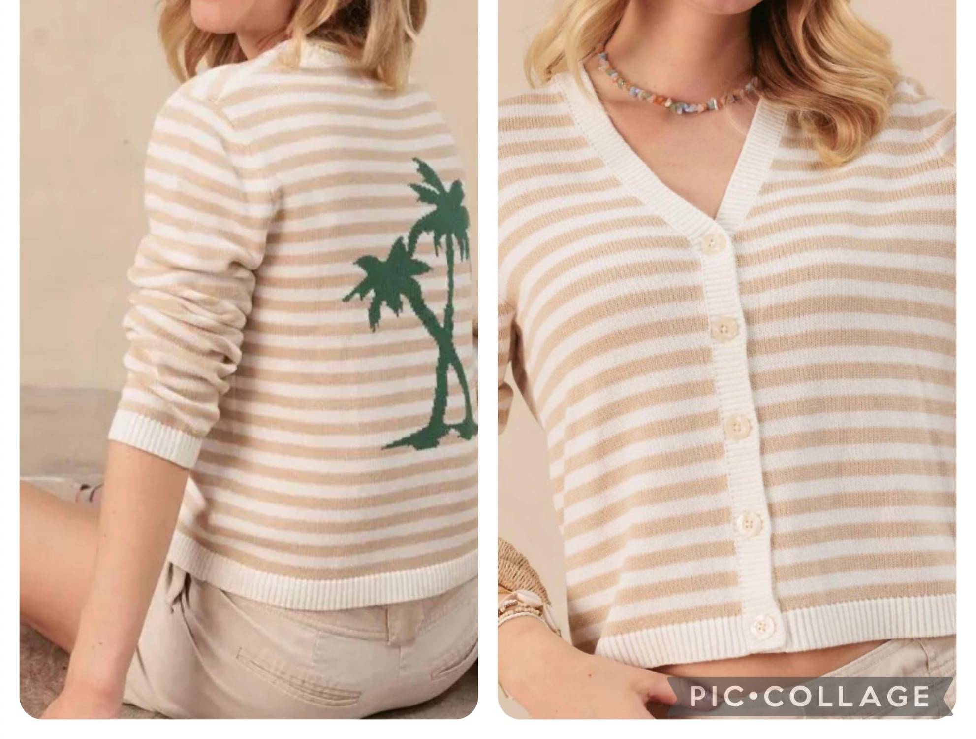 Throw this adorable cardigan over any cami or tank top. Striped cardigan with palm tree on the back