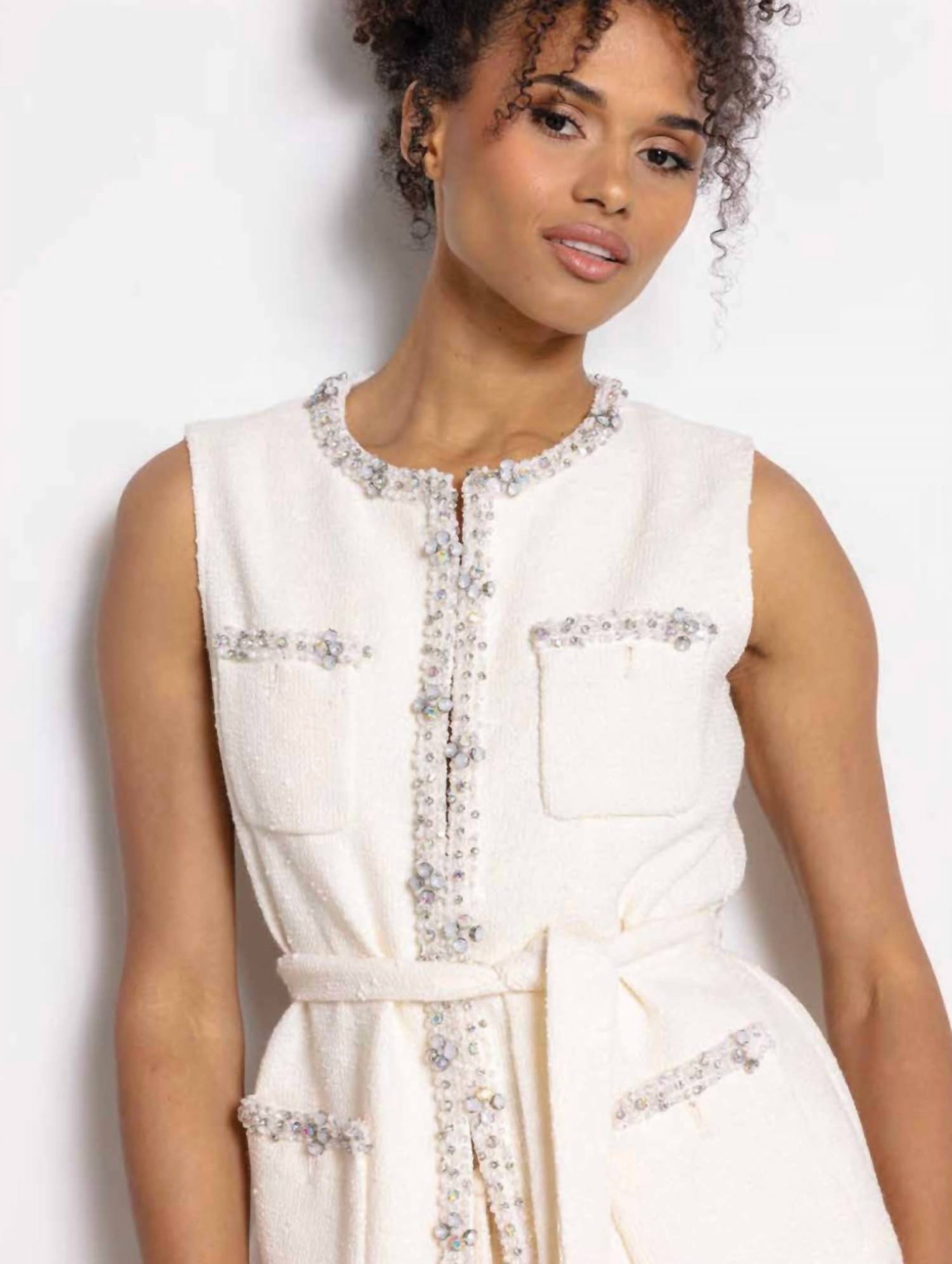 Elevate your spring wardrobe with the Sunny Embellished Belted Vest by Dream Catcher, impeccably crafted for women with a chic preppy aesthetic. This sleeveless vest in solid white features a button closure and convenient pockets, making it a versatile choice for holiday parties. Made from 82% polyester and 18% spandex, it offers a comfortable fit with a polished crewneck design. For optimal care, hand wash and line dry to maintain its pristine condition.
