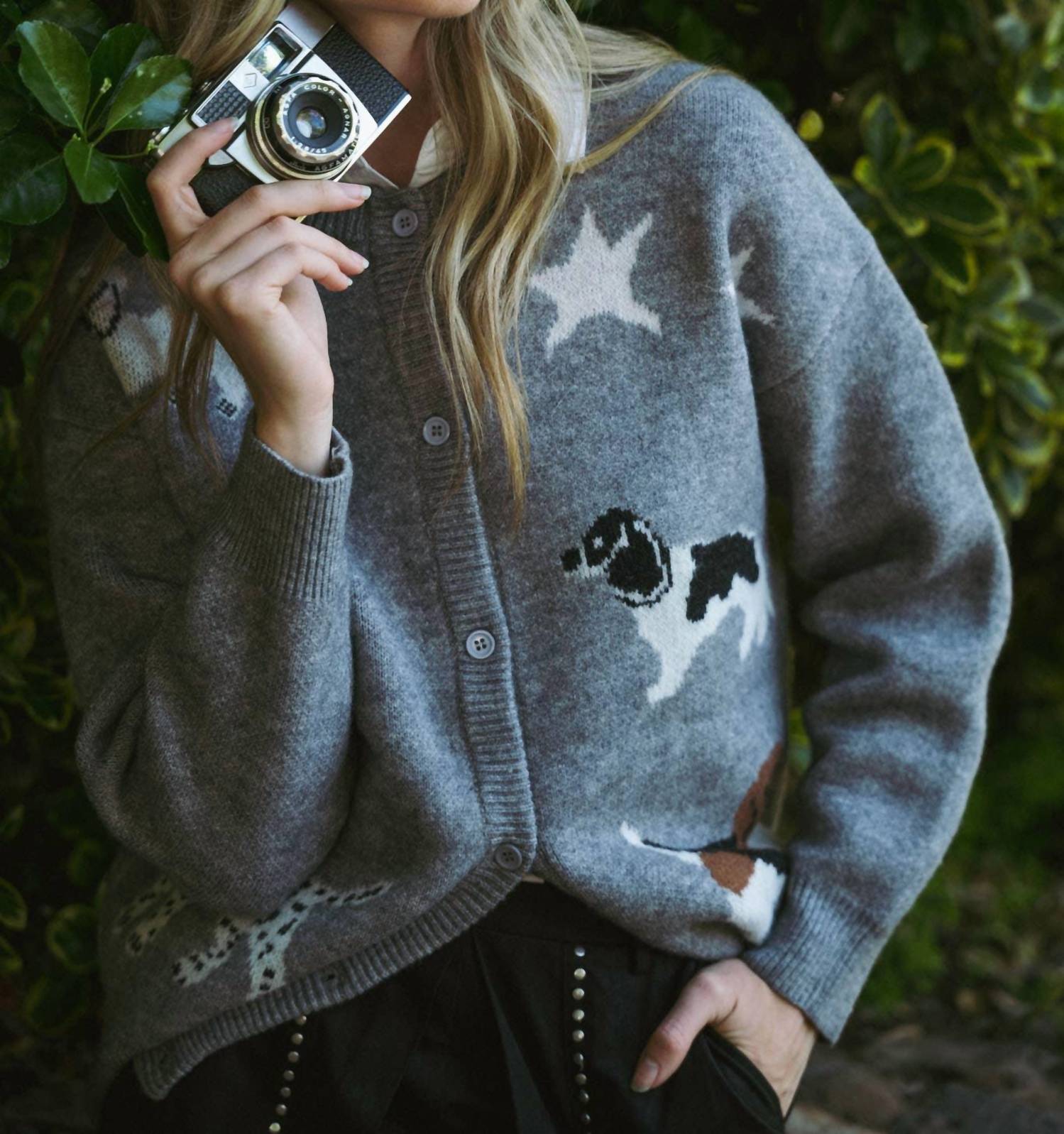 A classic fit that works just as good buttoned as it does left open. Experience cozy style with the Dog Knit Cardigan by &merci, perfect for a stylish holiday party. This grey cardigan features long sleeves with ribbed cuffs and a drop shoulder design, showcasing a unique dog knit graphic. Closure: Button down placket. The model, wearing a size small, stands at 5'10.5" and measures 32-24-36. Ideal for a minimalist fall wardrobe.