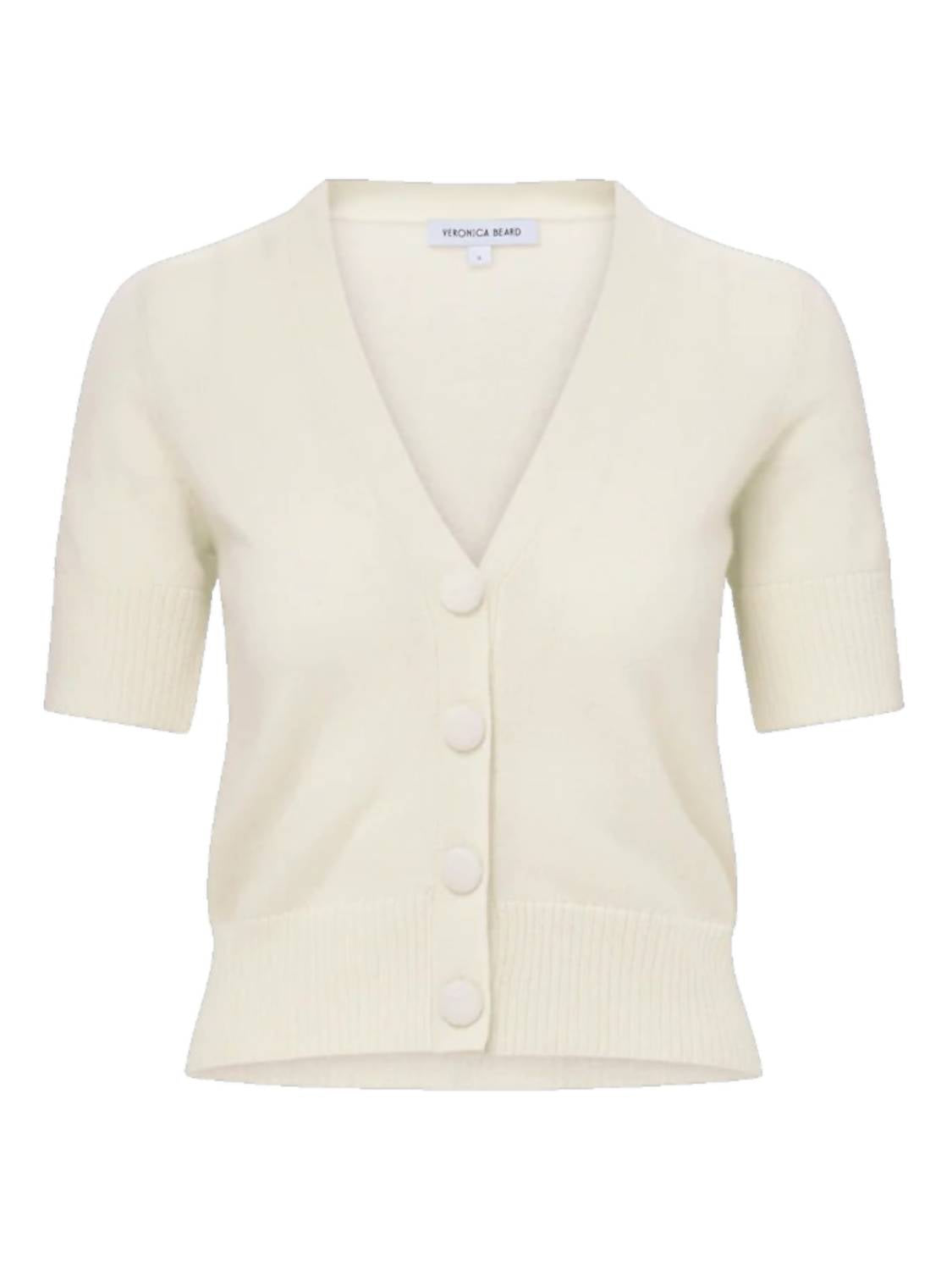 This cardigan will be a sweater-rotation favorite. Elevate your knitwear collection with the Solene Short Sleeve Cashmere Cardigan by Veronica Beard in a serene ivory hue. Crafted from 100% cashmere, this luxurious piece features short sleeves and a V-neckline, perfect for sophisticated layering. The cardigan boasts a garment length of 20.5 inches, adorned with tonal buttons and extra-wide ribbed trimming for a refined finish. Closure: Button closure. Care: Dry clean only. Sleeve length: 17.5 inches, based on a size S.