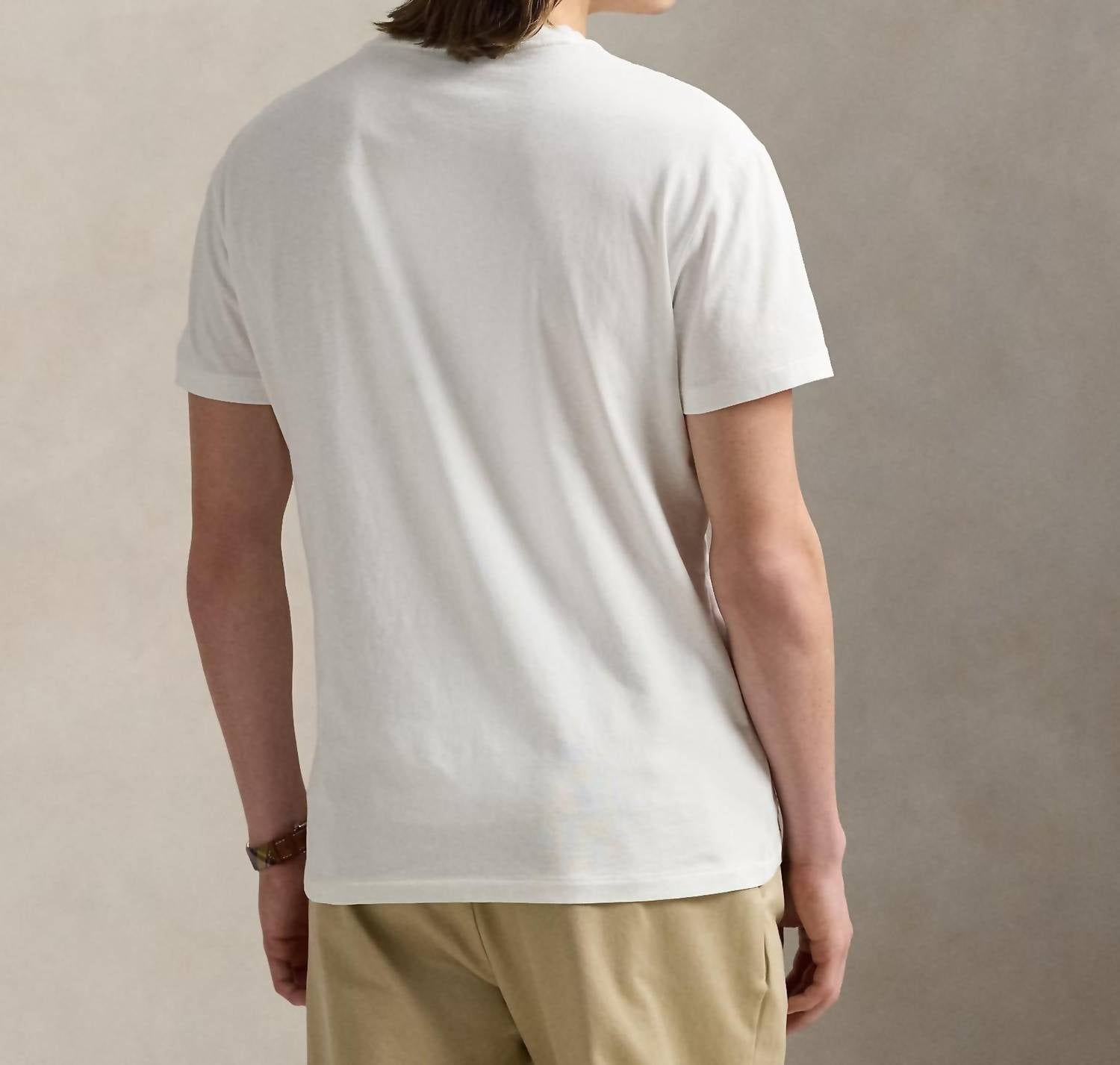 Introducing the Classic Fit Jersey Pocket T-shirt by Polo Ralph Lauren in Weathered White, a staple for minimalist summer wardrobes. Constructed from 100% cotton jersey, it offers a relaxed, classic fit with short sleeves and a casual crewneck. The design includes a left chest patch pocket and the brand's signature embroidered Pony at the right hem for a touch of sophistication. Care is convenient with machine wash, ensuring easy maintenance for vacation-ready wear. The size medium measures 28.5" in body length, 20" at the shoulder, and a 44" chest.