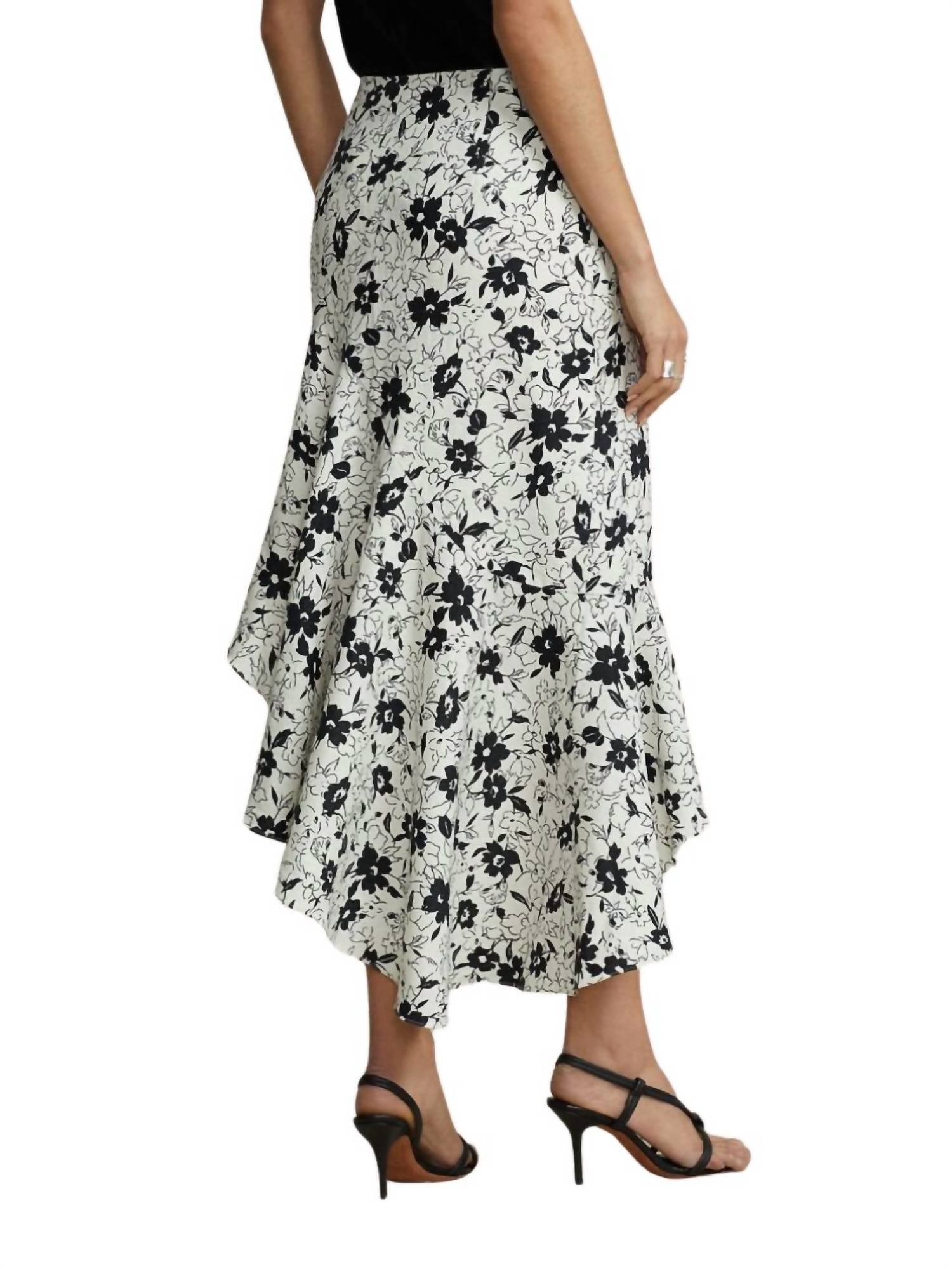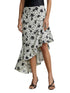 Mid rise. Skirt features a slim silhouette through the hips and a flowing ruffle panel along the asymmetric hem. 34.5" Back length. Concealed zipper, left side seam, with hook-and-eye closure. Machine wash cold. 100% Cotton.