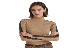 Ralph Lauren Women's Faux Leather Trim Turtleneck Sweater Brown Size Large