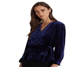Ralph Lauren Women's Belted Velvet Peplum Surplice Top Blue Size X-Large
