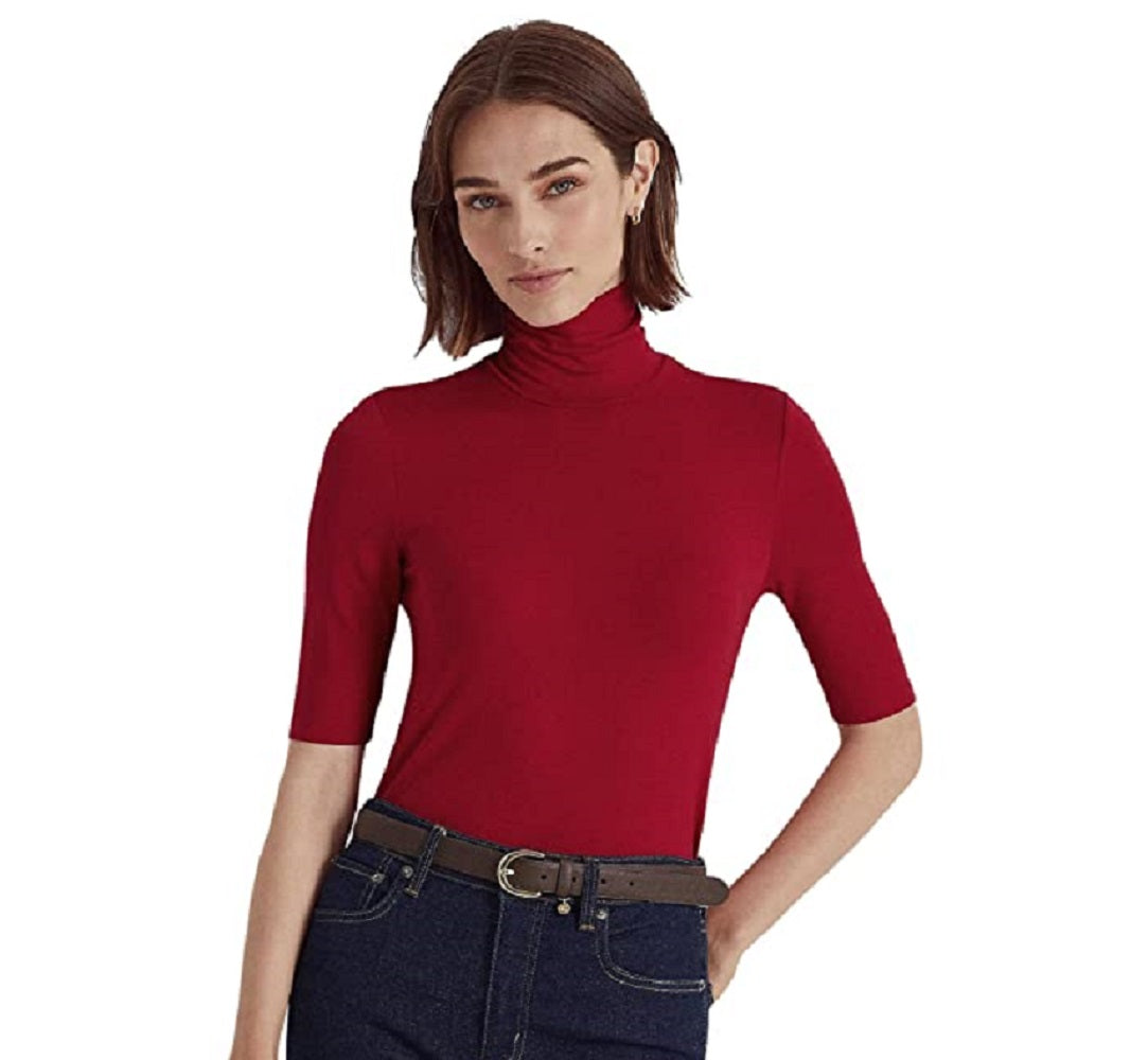 ; The Ralph Lauren Stretch Jersey Turtleneck has the lightweight design to keep you feeling confident all day| Elbow-length sleeves| pull-on style with mock neck| and a straight hem| Pair with your favorite jeans or slacks for a refreshing everyday style| 97% viscose| 3% elastane