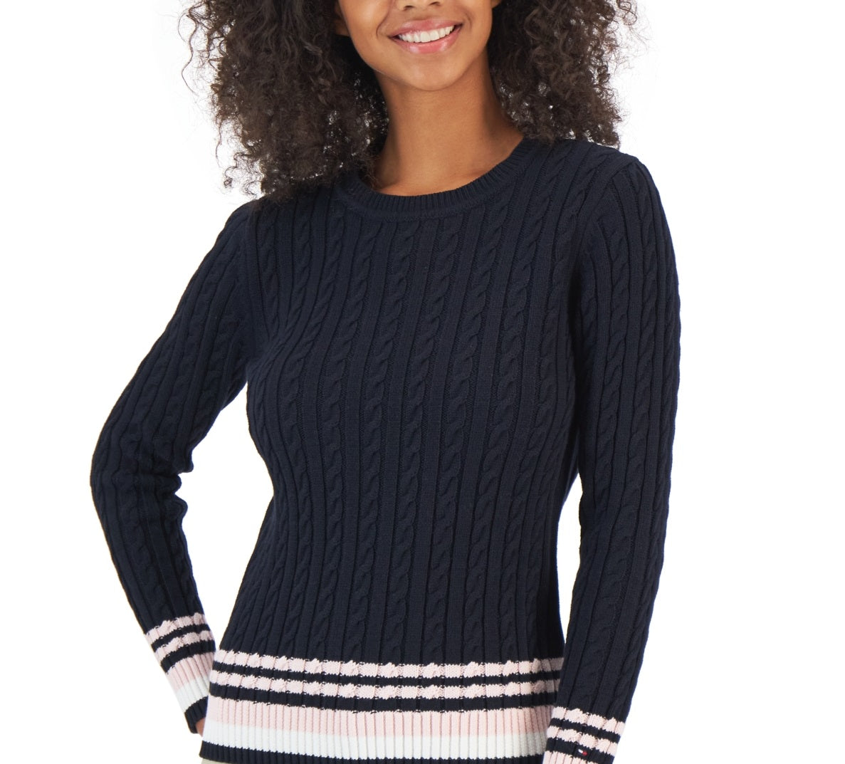 A classic cable-knit pick from Tommy Hilfiger| this cozy sweater is designed entirely in fresh cotton and finished with tipping detail