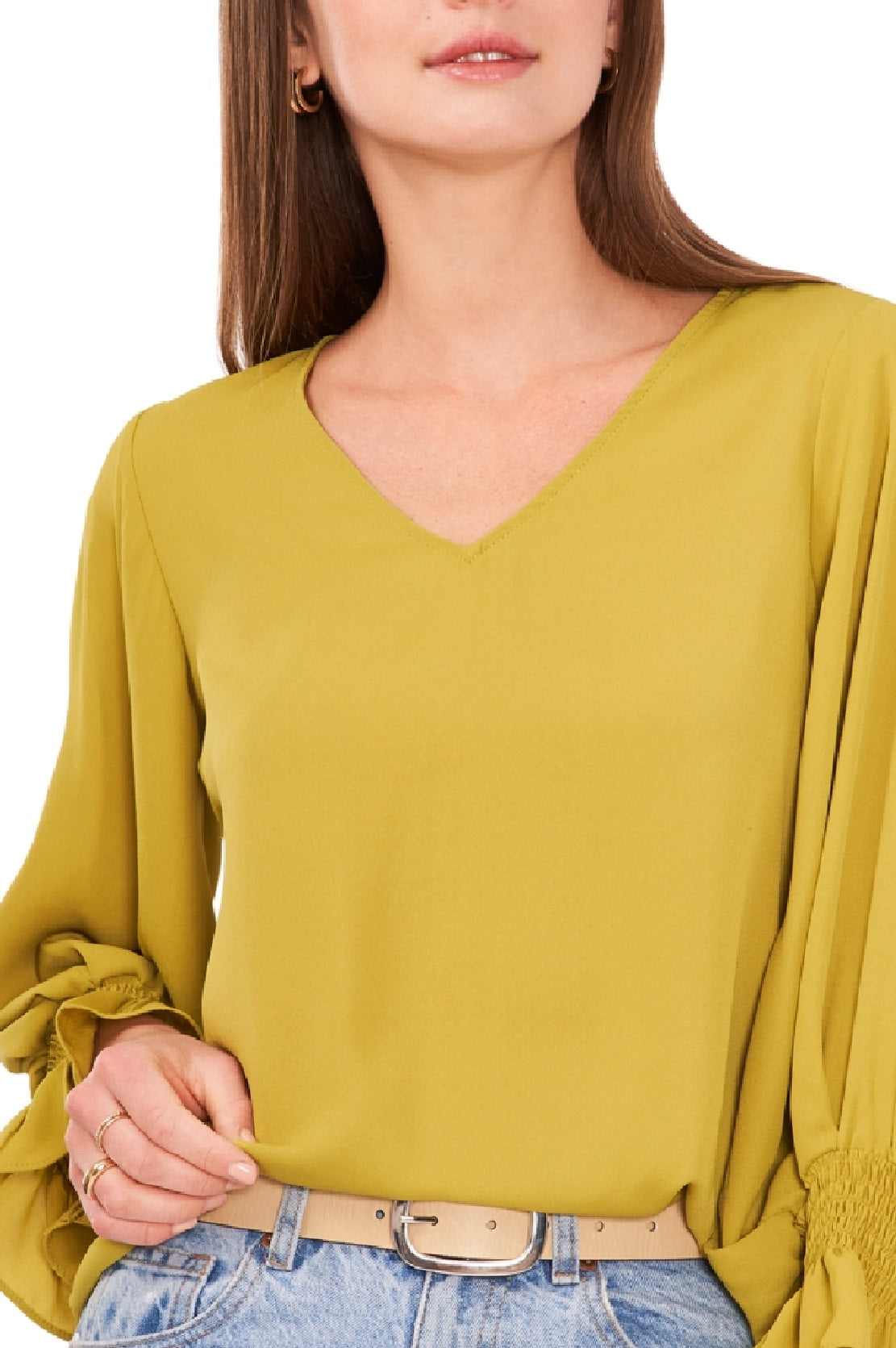 Long bell sleeves with smocked cuffs frame this flowy blouse| V-neck Long sleeves 100% polyester Machine wash| dry flat Imported
