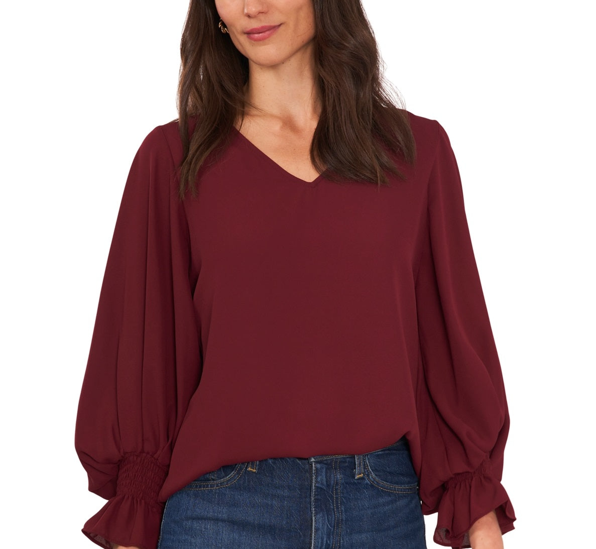 A stylish way to polish jeans or update a printed skirt| this Vince Camuto top features flowy sleeves capped with stylish ruffles.| Imported| V-neck| Long sleeves with smocked cuffs| ruffles|