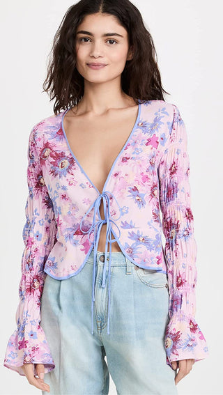 Free People Women's Venice Floral Tie Front Top Purple Size X-Small