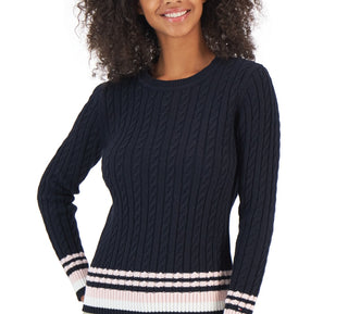 Tommy Hilfiger Women's Cotton Cable Knit Tipped Sleeve Sweater Blue Size X-Large