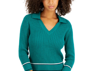 Tommy Hilfiger Women's Cotton Johnny Collar Cable Knit Sweater Green Size Medium