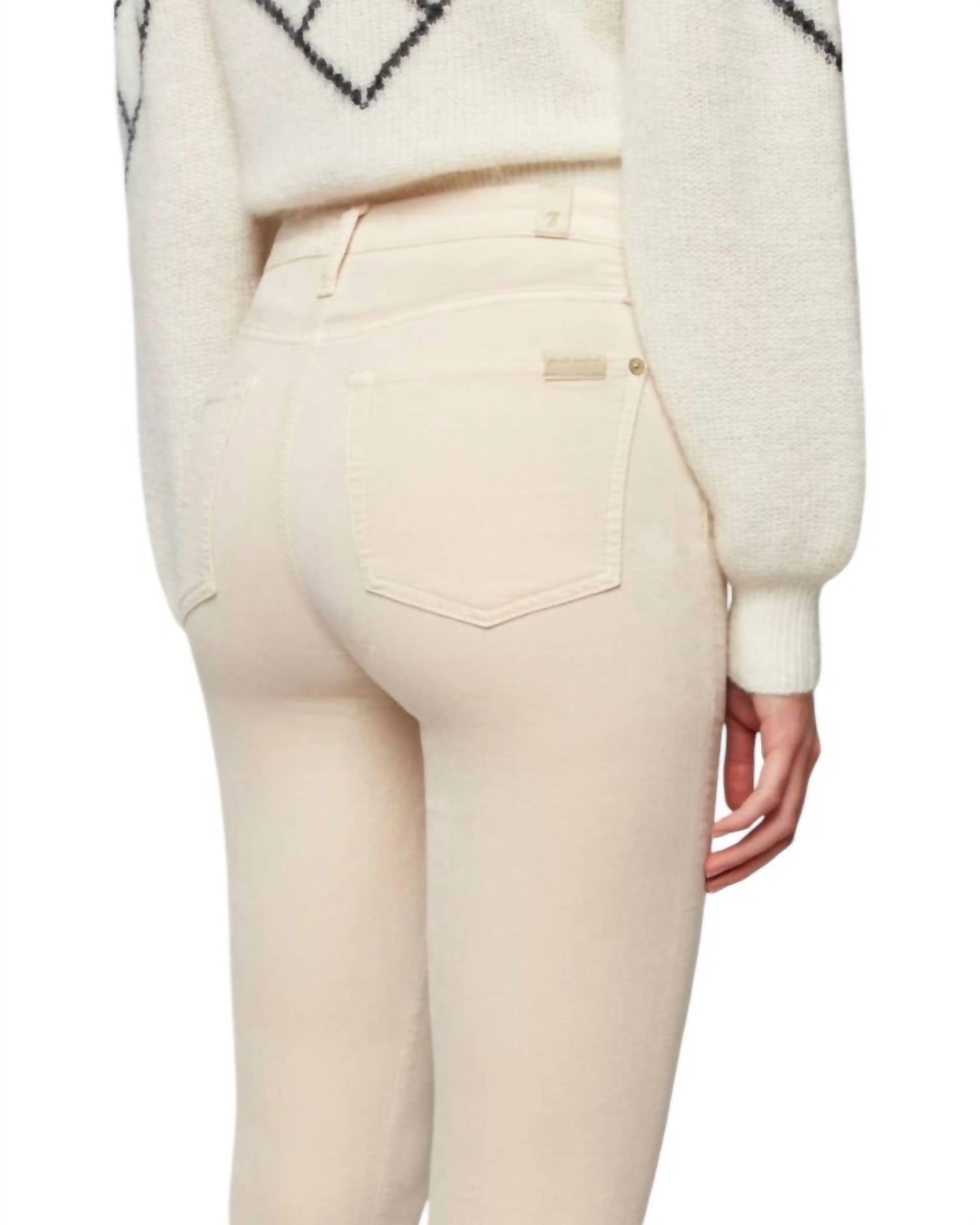 Elegance and comfort in the alluring Tapioca shade. Blending the luxurious feel of stretch velvet with the timeless appeal of a high waist, skinny ankle silhouette. Soft, cotton-based material ensures a flattering fit and superior comfort. 10.75-inch high rise and a 27-inch inseam. Provide a sleek, figure-enhancing profile. Complete with functional pockets and a secure button closure. Add a touch of texture and a dash of grace to your wardrobe with this must-have staple crafted for the modern woman.