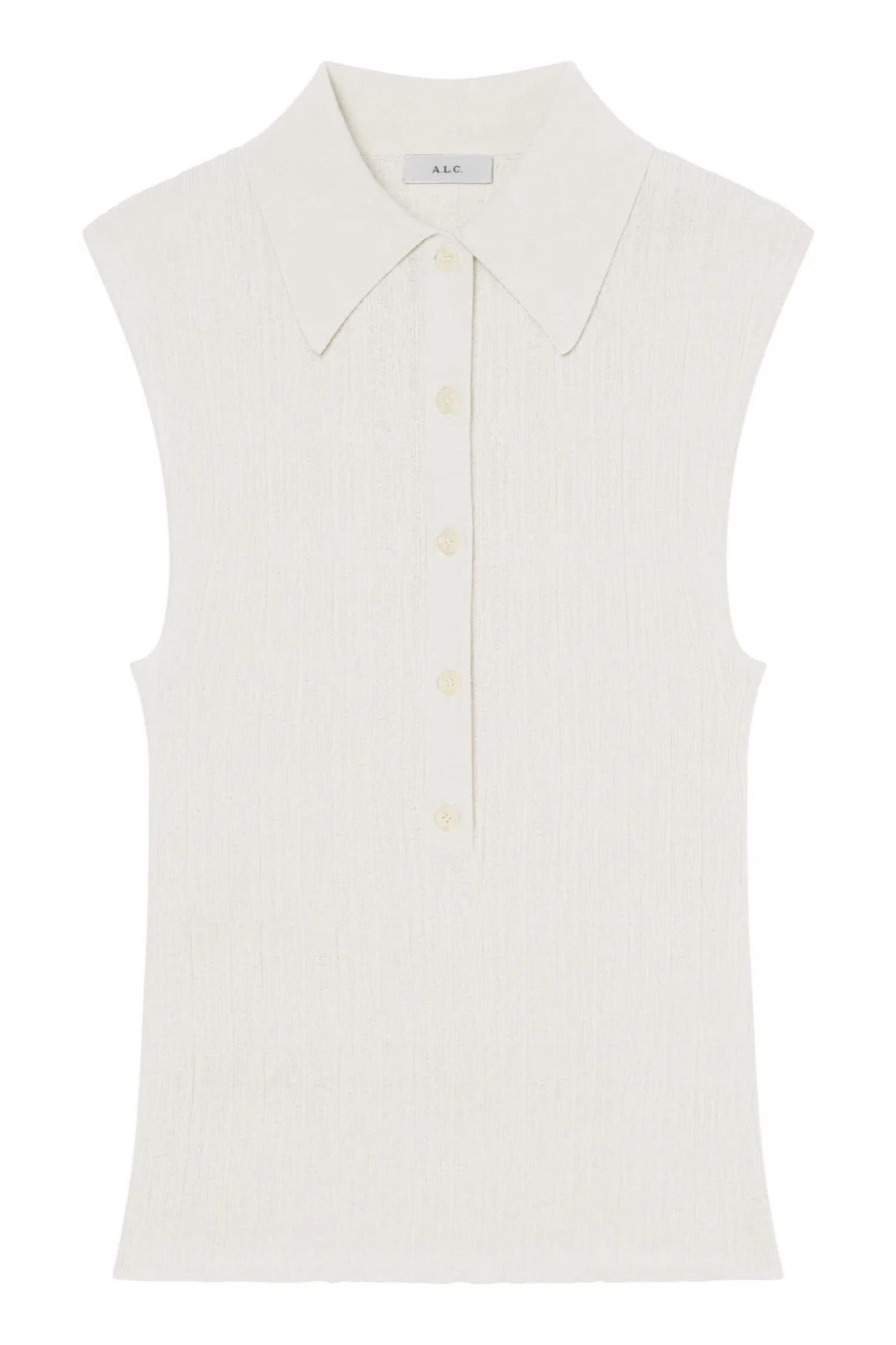 Meet the Ollie Sleeveless Top by A.L.C., a chic addition to your minimalist summer wardrobe. Crafted from a blend of 78% cotton and 22% nylon, this textured piece showcases a classic spread collar and a convenient button placket. Designed to flatter, it measures a stylish 22.375" in length. To maintain its pristine bright white hue, a dry clean is recommended.