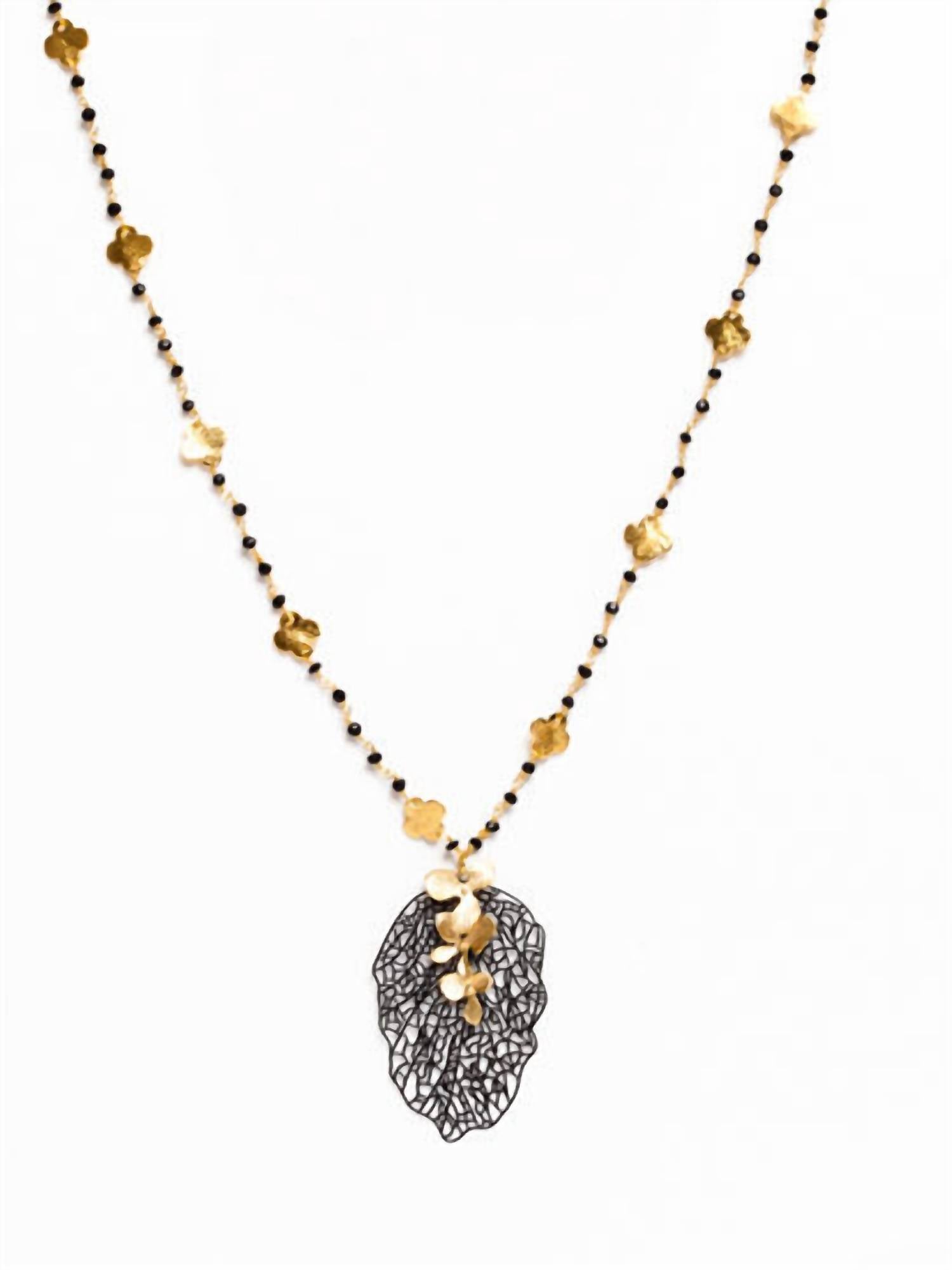 The perfect stand-out necklace that complements even the most basic t-shirt. Elevate your accessory collection with the Women's Clover Orchid Necklace by Avenue Chic, a stunning combination of elegance and style. This fine jewelry piece features a gold-plated design, accented with a black filigree leaf and a shimmering golden orchid pendant. Crafted with sophistication, it is an exquisite simulant gem creation. A perfect addition for both casual and formal occasions, adding a touch of luxe to your look.