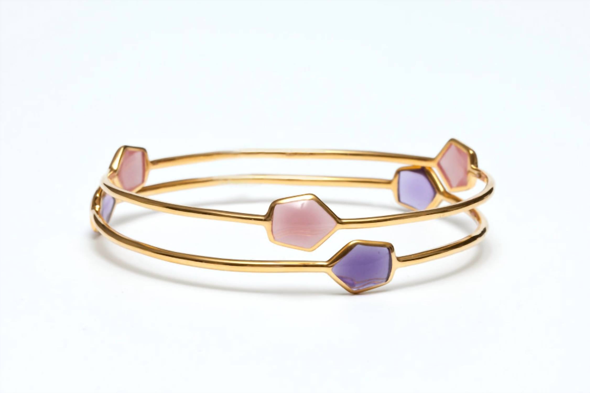 This bracelet will be your favorite go-to piece of the season. Introducing the Women's Vesta Stacking Bangle by Avenue Chic, a striking piece in a chic pink hue. This fashion bracelet features a stunning pink simulant stone and sleek gold plating for a luxurious finish.