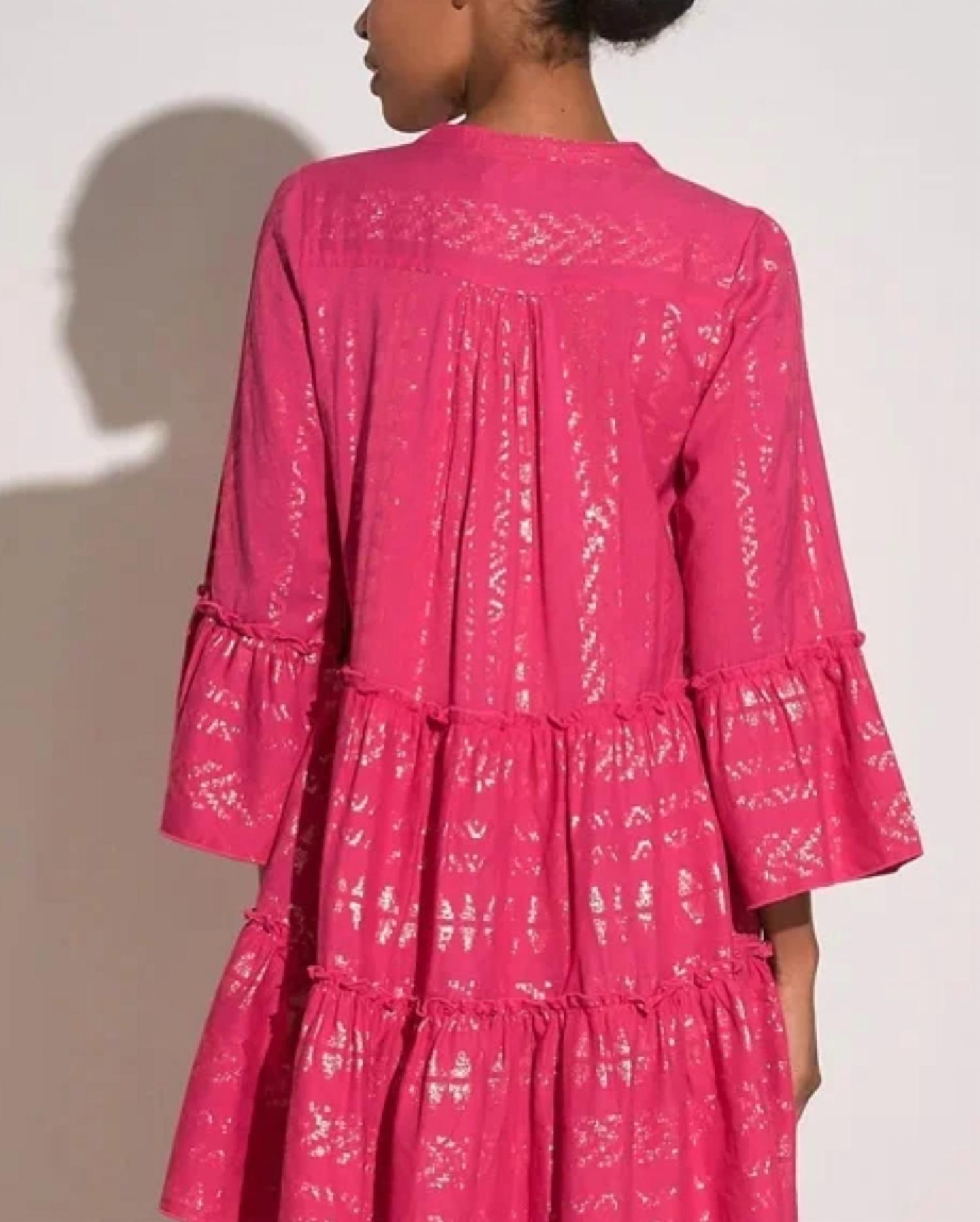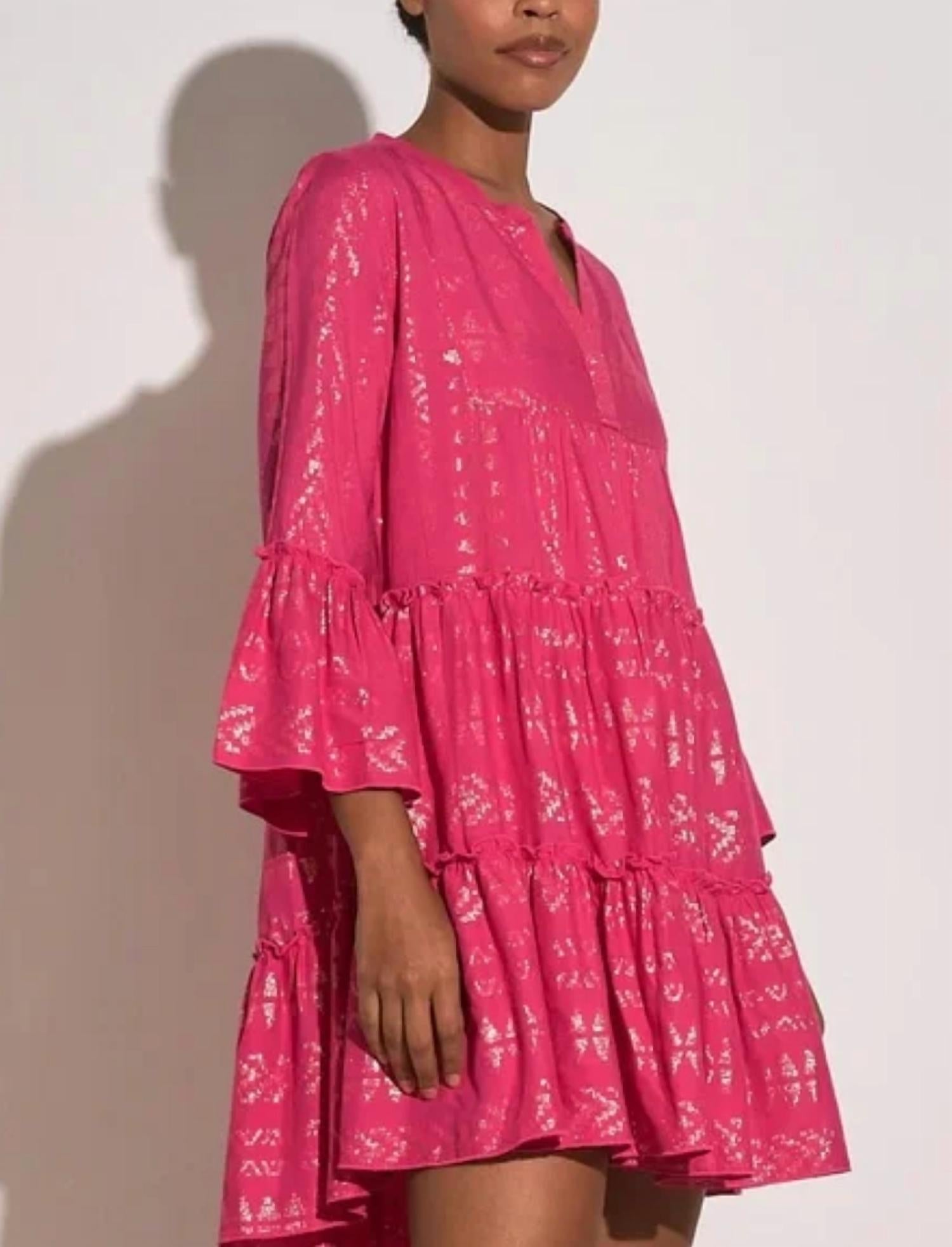 A short and breezy dress for those warmer days. Embrace the spirit of Spring with the ELAN Women's Clara Mini Dress in a vibrant pink, perfect for your next vacation. This boho chic A-line dress showcases long sleeves and a stylish V-neck, with a patterned design that adds a playful touch. Silhouette: A-line. Closure: Pull-on style. Country of Origin and care instructions not specified. 47% Cotton 47% Viscose 6% Metallic