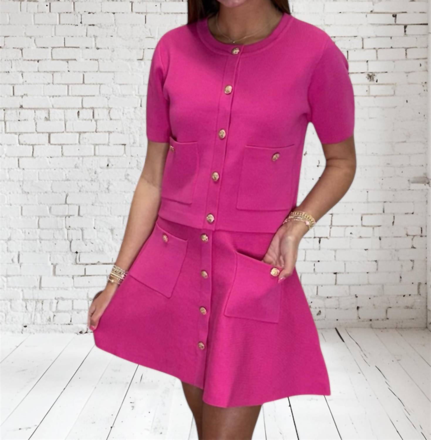 Experience effortless chic with the Women's Button Cardigan Skirt Set by Entro, perfect for your summer vacation. This pink knit set features a solid short sleeve sweater cardigan with an accented gold button front closure and patch pockets, alongside a matching A-line circle mini skirt with a faux placket and patch pockets. Expertly crafted from a luxurious blend of 57% Viscose, 22% Polyester, and 21% Nylon, this lightweight and non-sheer ensemble embodies the maximalist trend. Ideal for sizes S to L, it offers a relaxed yet stylish fit.