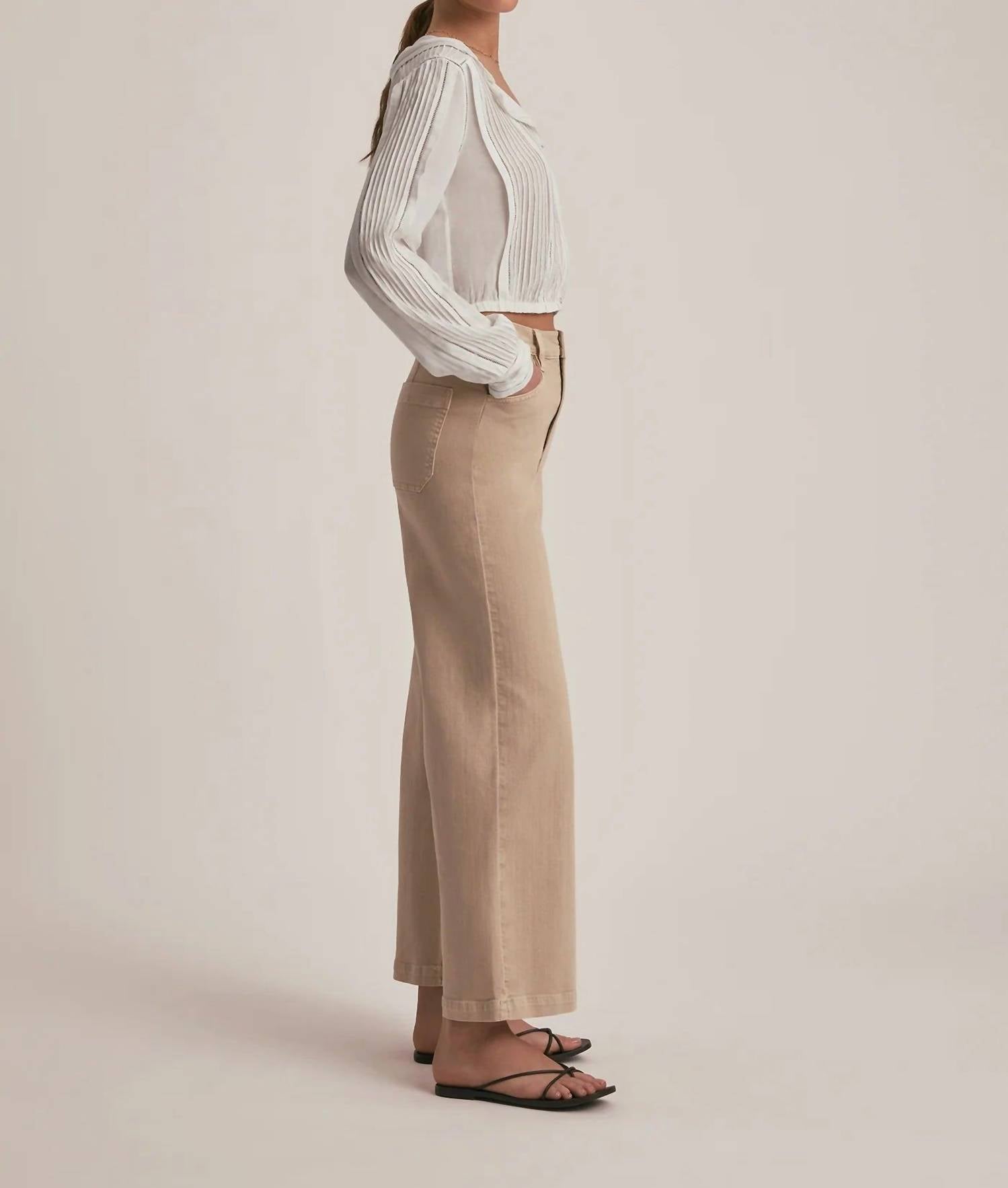 Elevate your wardrobe with the Mischa Super High Rise Wide Leg Ankle Pant by Favorite Daughter, crafted in a solid French Oak hue. Designed with a relaxed fit and high rise, these woven trousers offer a flattering silhouette with a wide leg style. Made from a cotton blend composition of 91% cotton, 7% polyester, and 2% elastane, these pants promise comfort and style. Featuring a convenient button closure and practical pockets, they are easy to care for with machine wash and tumble dry instructions. Perfect for minimalist vacation ensembles, these pants are ideal for your spring wardrobe.