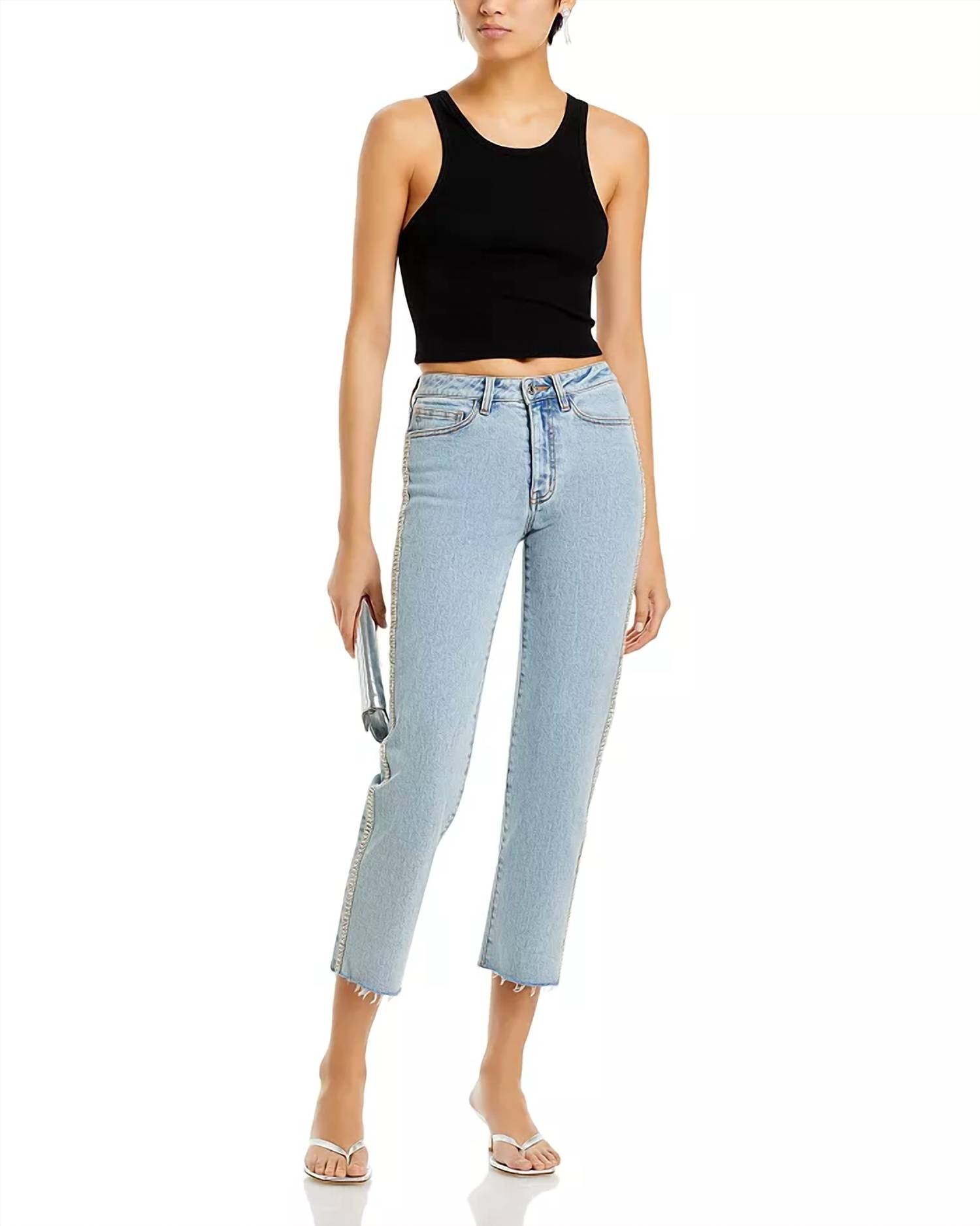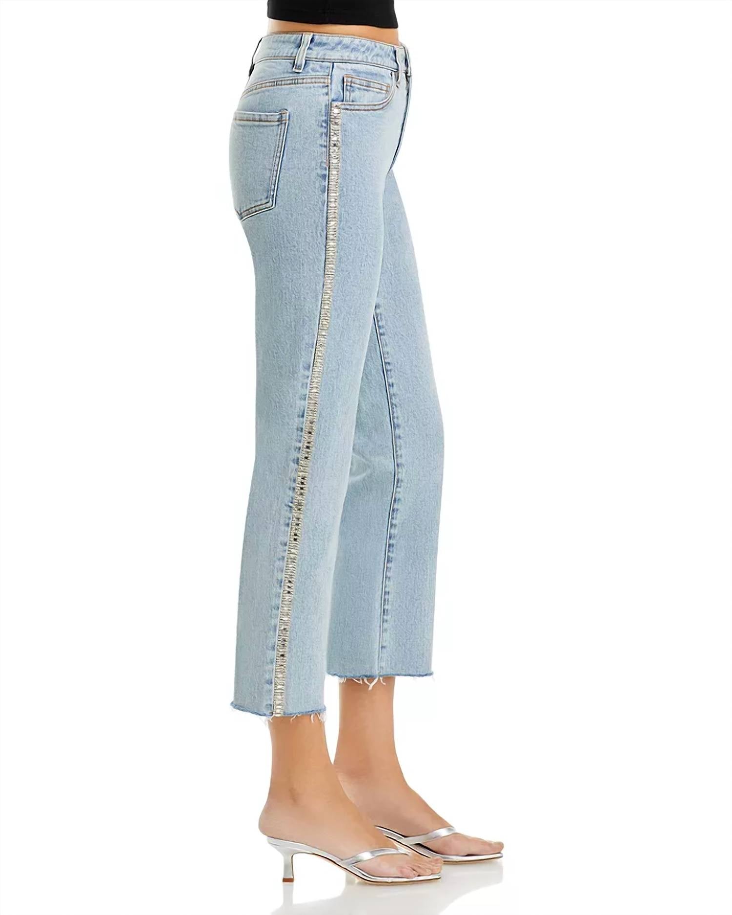 The Baylor Denim Pants by Generation Love are the ultimate statement piece for your wardrobe, featuring a trendy wide leg silhouette with raw edges and dazzling crystal trim down the sides. Crafted from 99% Cotton and 1% Elastane, these jeans offer a slim fit and mid-rise waist for optimal comfort and style. Closure: Zip closure. Care: Hand wash, lay flat to dry or professionally dry clean. With a 26.75" inseam, these light blue pants are designed for a bold look, perfect for a holiday party or a night out with friends. Model is wearing a size XS (5'10" height).