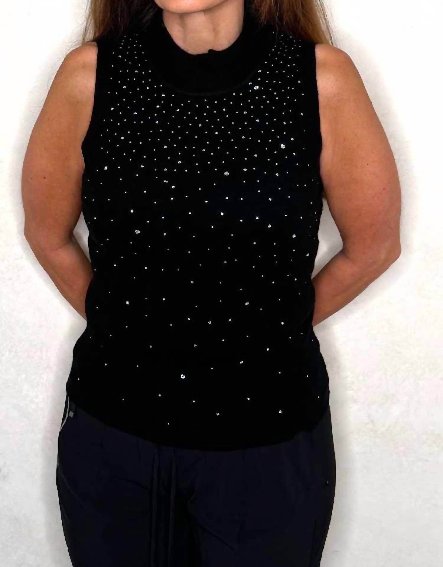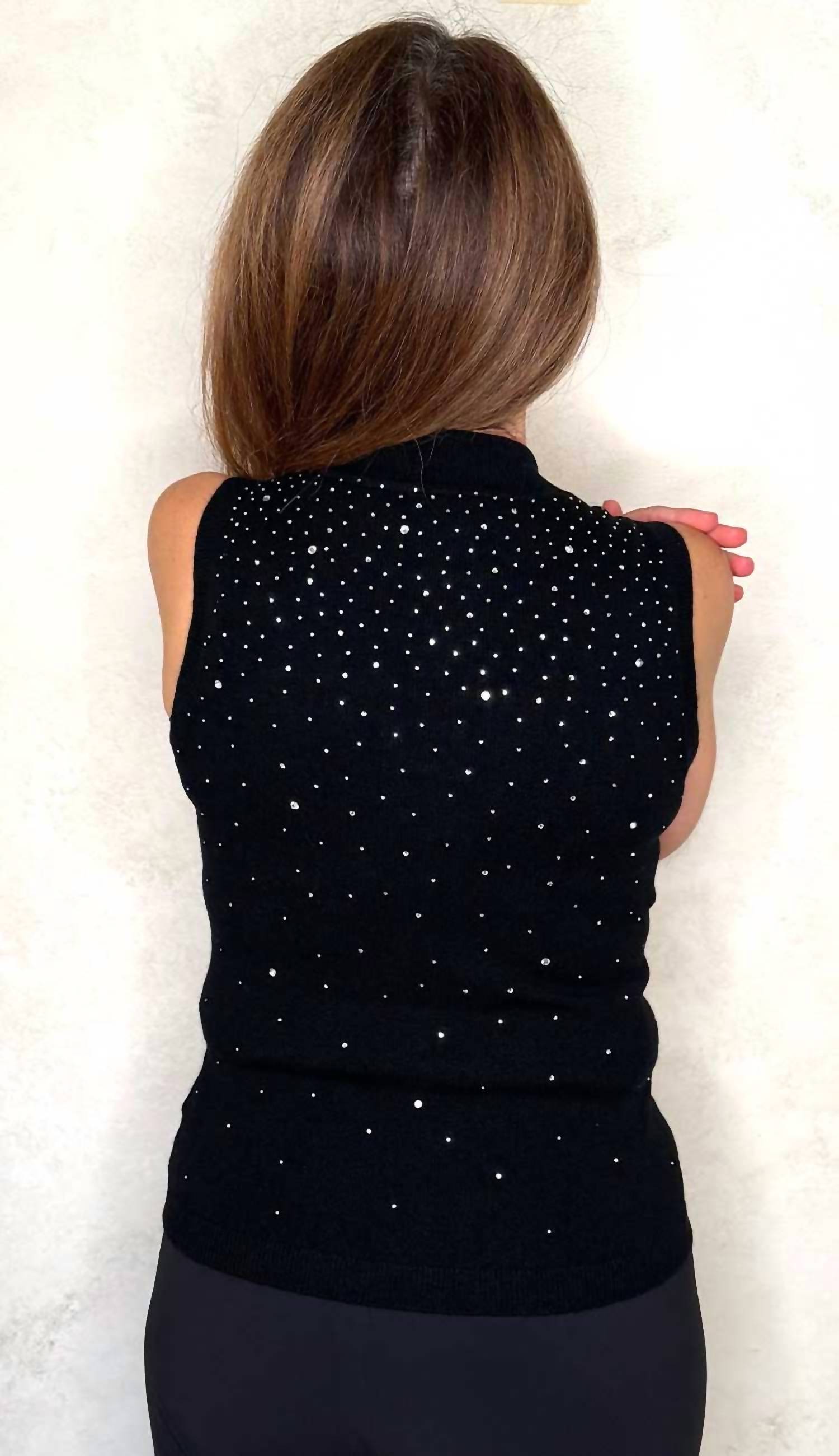 This classic tank top is perfect for layering and cute enough to wear on its own. Elevate your holiday wardrobe with the Emerson Crystal Tank by Generation Love, a standout piece in classic black. This sleeveless tank features delicate crystals that provide just the right amount of sparkle, enhancing its elegant polka dot pattern. Crafted from 100% ultrafine Merino wool, it offers a luxurious feel with a slim fit and mockneck design. Measuring 22 inches in length, this pull-on style is perfect for any occasion, and it ensures easy care with hand wash and lay flat to dry instructions.
