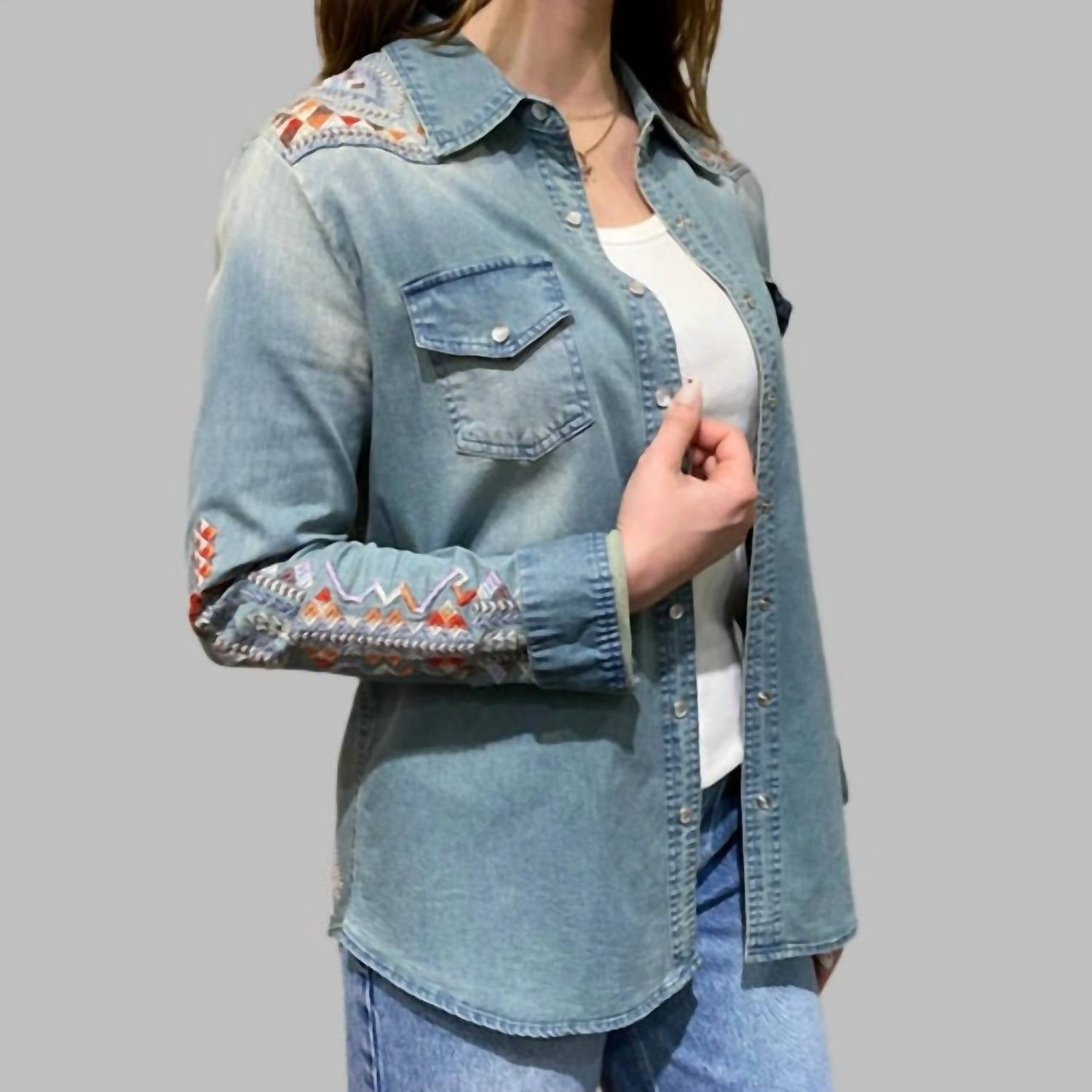 A classic button down shirt that will never go out of style. Be prepared to WOW in this jean shirt/jacket! Indulge in the luxury of the Kresley Western Shirt in Denim Blue. This exquisite piece features delicate embroidery and elegant pearl snap buttons. With a touch of sophistication and a hint of classic Western style, this shirt will elevate any outfit. Machine Wash