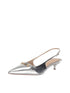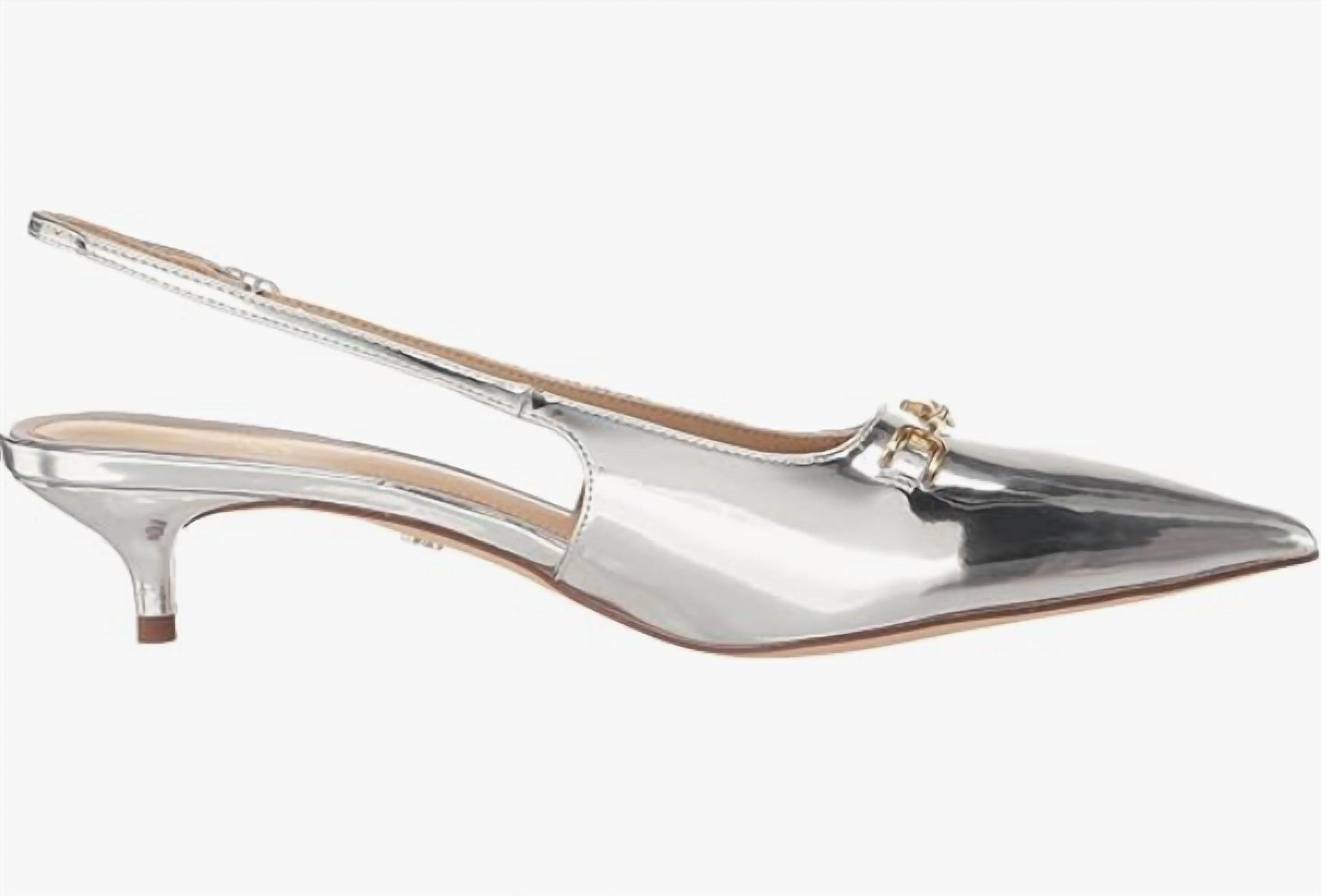 Step into sophisticated style with the Women's Fitzgerald Slingback Pump by Sam Edelman in Soft Silver. This elegant heel features a chic pointed toe and a comfortable kitten heel height of 1.4 inches. Crafted from synthetic materials, it boasts a stylish horsebit detail, reminiscent of classic Oxford designs, and is secured with a buckle closure. Perfect for Spring events or a New Year's Eve wedding, this versatile pump effortlessly complements any workwear ensemble.
