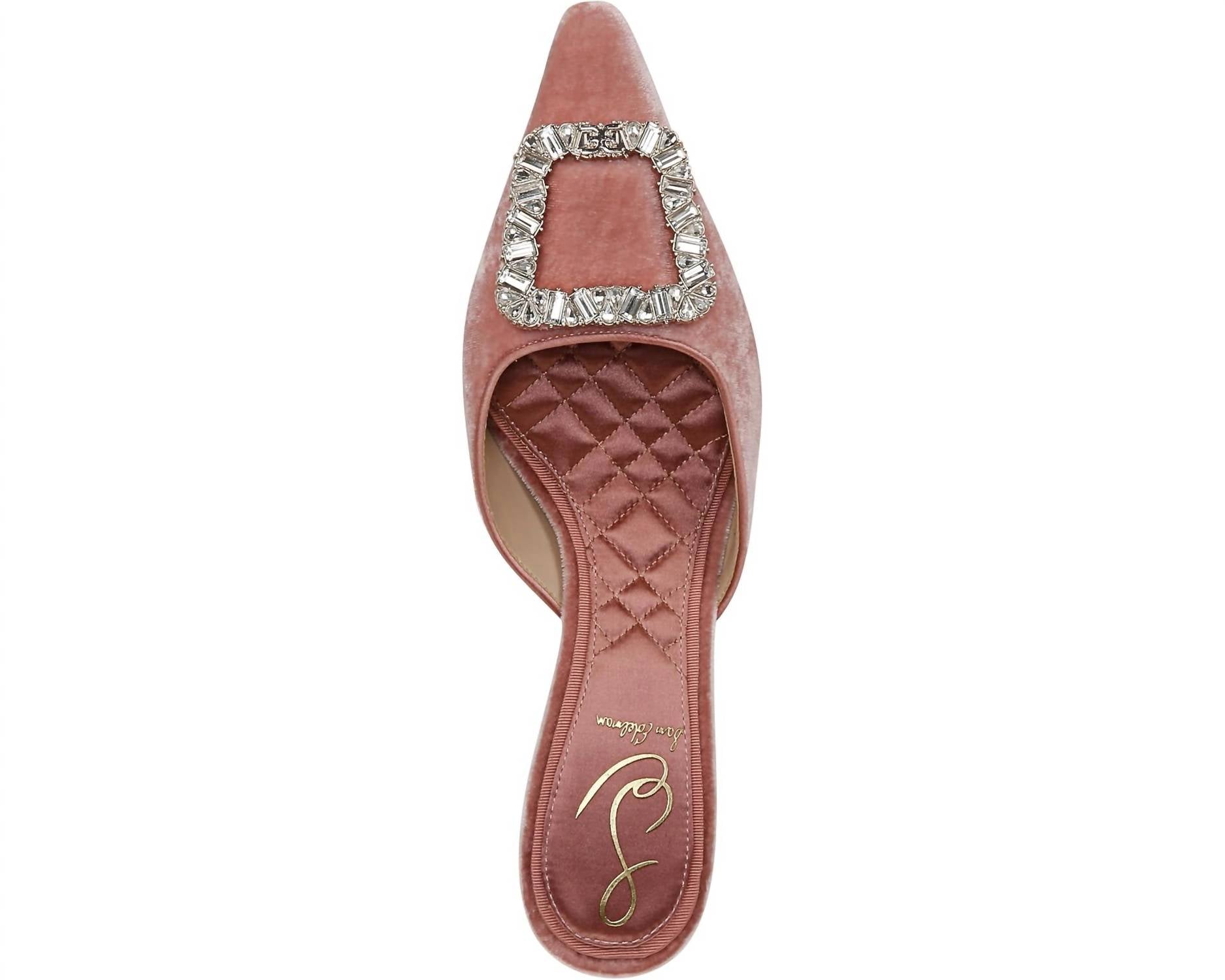 Don't be deceived, these heels are comfy as can be. Introducing the Women's Lush Brit Glow Mule by Sam Edelman, an exquisite addition to any summer wardrobe. Designed in an opulent Winter Peony Velvet, this shoe features a crystal buckle and textured upper, perfect for pairing with leg-baring skirts and dresses. Made from fabric with a pointed toe and a mid 2.3-inch kitten heel, these mules embody quiet luxury. Ideal for engagement occasions, they align with the latest trends, offering both elegance and comfort.