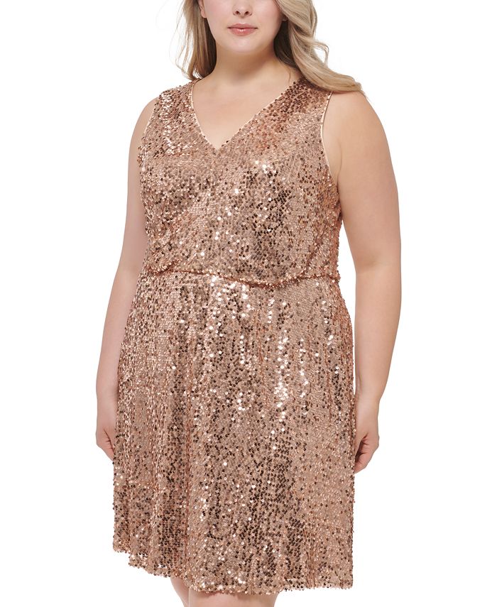 Shimmering sequins are the star of the plus size V-neck dress from Vince Camuto.| Approx. 38-1/2 long from center back neck to hem. Length is based on size 18W and varies 1/4 between sizes| Fitted through the chest and waist; flared and flowing skirt| V-neck; Fit & flare silhouette| Exposed back zipper| Elastic waist; sequined detail throughout| Sequins may shed during wear