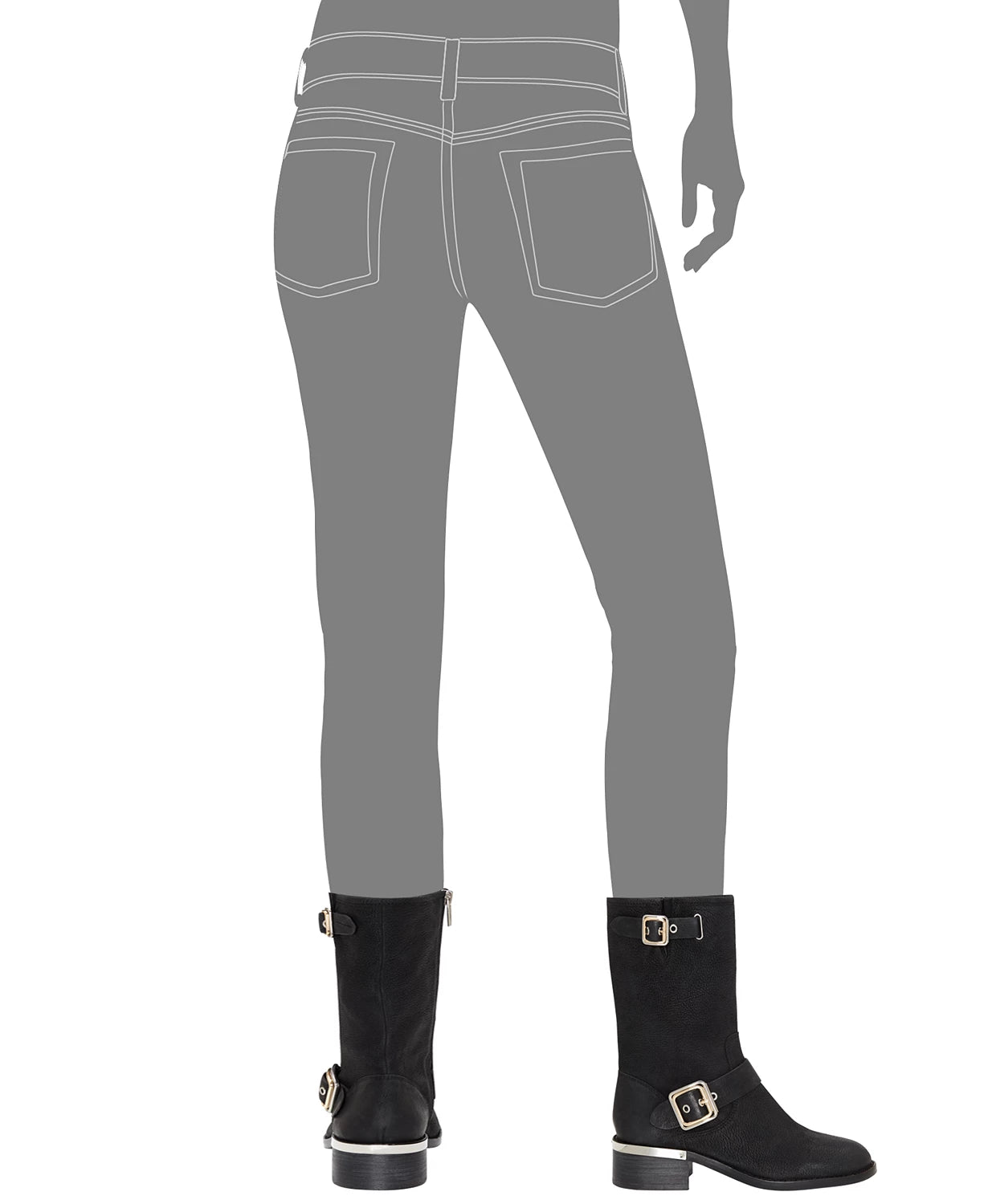 Fabric content and colors include:|Leather in black or Suede in foxy|Round-toe boots with side zipper|Buckled strap details at ankle and side; metallic plate at top of heel|Shaft Height: 9.5 inches|Shaft Circumference: 12 inches (Based on Size 7)|1-3/4" heel