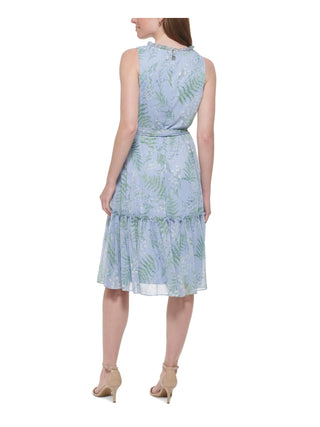 Tommy Hilfiger Women's Zippered Ruffled Tie Belt Floral Sleeveless Round Neck Midi Fit Flare Dress Blue Size 8