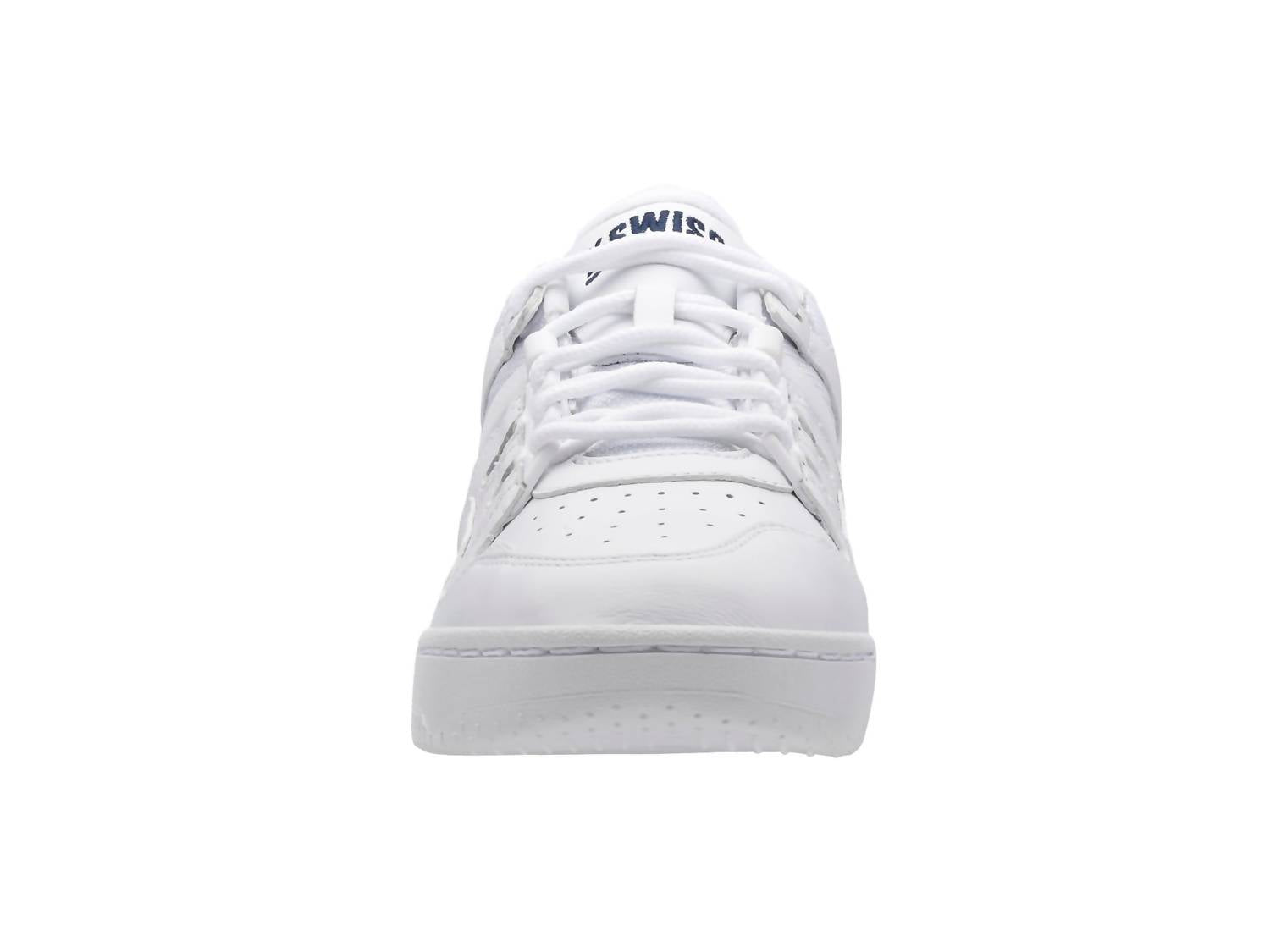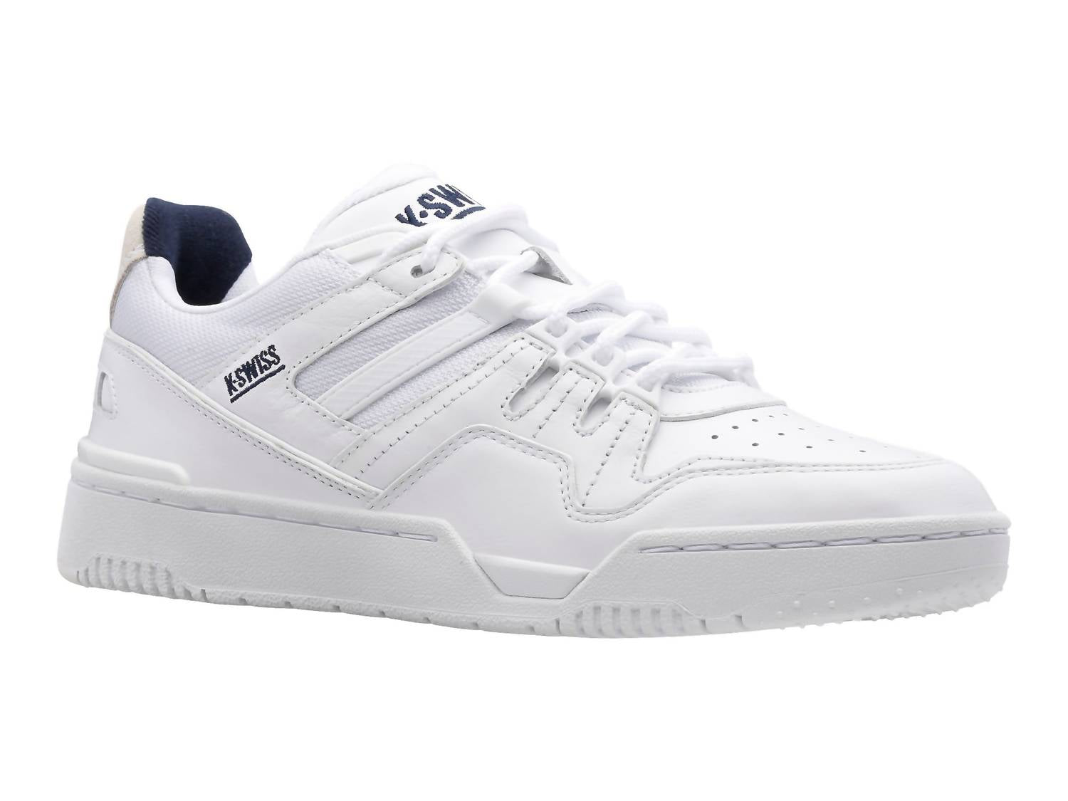 Introducing the Men's Match Rival Lace Up Sneakers by K-Swiss, a celebration of 80s technical performance fused with modern flair. These white sneakers boast a leather upper with a textile collar lining, supported by a two-part rubber cupsole with SurgeLite CMEVA midsole for exceptional comfort and support. The lace closure ensures a secure fit, while the Ortholite sock liner enhances breathability. Ideal for everyday wear, these sneakers feature a flat heel perfect for a back-to-school look inspired by 90s fashion trends.