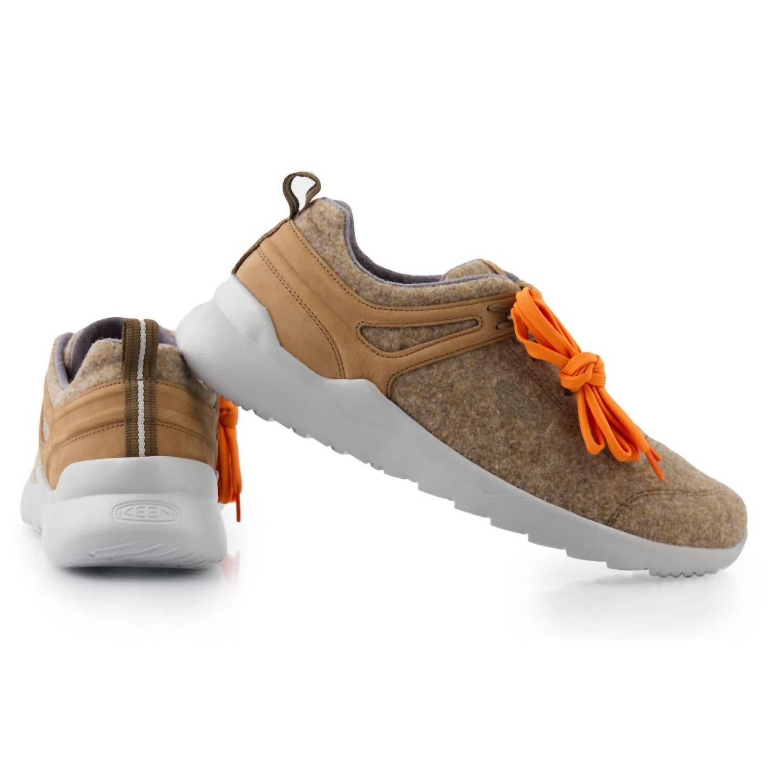 Introducing the Men's Highland Arway Hiking Boot Shoes by Keen, blending style and sustainability with 50% recycled wool and leather upper. These brown sneakers provide comfort with a cushion that relieves the Achilles tendons and a sneaker-like fit for ultimate versatility. The non-marking EVA midsole and rubber outsole are designed for all-day comfort and durability. Care for these medium-width, flat heel, round toe shoes with light brushing; do not machine wash. Ideal for athleisure trends and perfect for spring camping adventures.