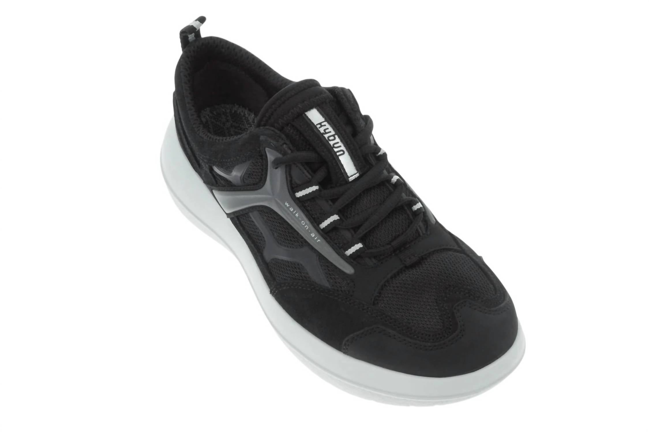 Experience the perfect blend of style and functionality with the Men's Sursee 20 Athletic Shoes by Kybun. This sneaker comes in a trendy black color with a white sole and gray accents, suitable for any athleisure look. A breathable mesh material ensures a cool foot climate, making it ideal for spring workouts or fitness sessions. With a low wedge heel ranging from 1 1/4" to 2" and a comfortable round toe shape, these shoes promise both comfort and performance.