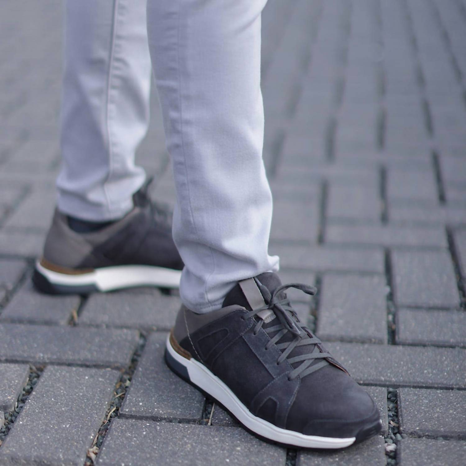 Discover the Men's Magnify Sneaker by NAOT, a perfect blend of style and comfort. Featuring a premium combination of oily midnight suede and foggy gray leather, this sneaker includes a removable cork and latex footbed for all-day support. Its 1.5" rubber sole ensures durability with a hand-sewn Strobel construction for exceptional flexibility. Orthotic friendly and APMA accepted, this sneaker is designed for promoting good foot health and fits true to size, with half sizes suggested to size up.