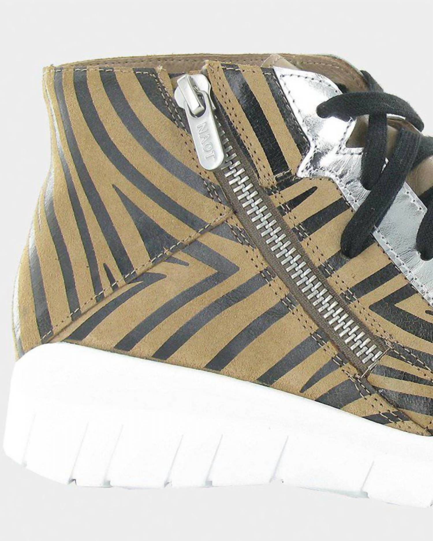 Cute, functional, and comfortable. These sneakers check all the boxes. Introducing the NAOT Women's Polaris Arizona Shoes, an athleisure essential in a striking Tan Zebra Silver. Crafted from premium leather, these sneakers are designed with a flat heel for comfortable everyday wear. The slip-resistant sole ensures stability, while the cork & latex removable footbed offers lasting comfort. Featuring both outside zippers and stylish laces, these shoes provide easy wearability and a fashionable edge.