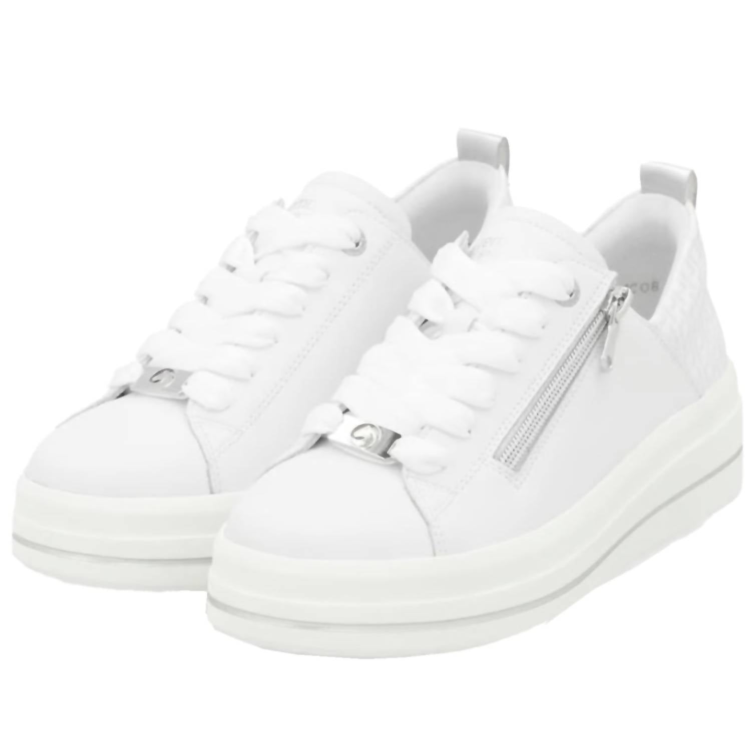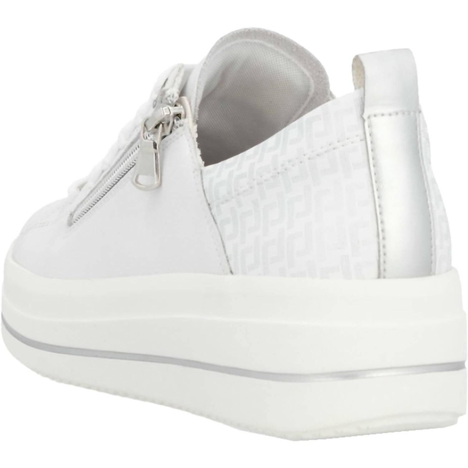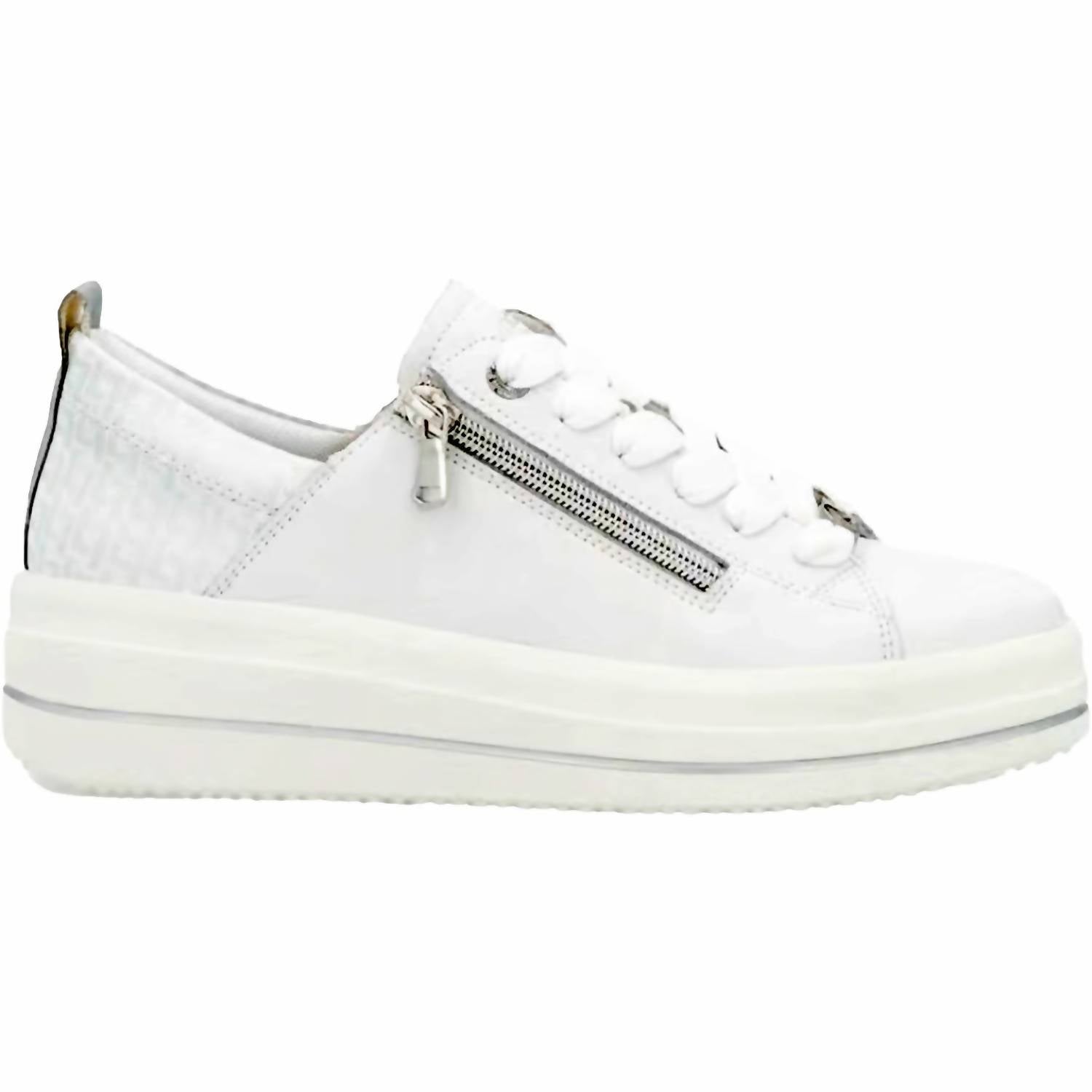 When fashion and function come together seamlessly. Elevate your style with the Women's Leather Sneakers by Remonte, featuring a chic white and silver leather design. These sneakers provide a comfortable medium width with extra room for wider feet, ensuring optimal freedom of movement for your toes. Crafted with a genuine leather upper, they boast exceptional breathability and weather resistance. Perfect for spring travel or holiday outings, these flat heel sneakers include a removable cushioned insole and a flexible ultralite Lite-n-Soft outsole for all-day comfort.