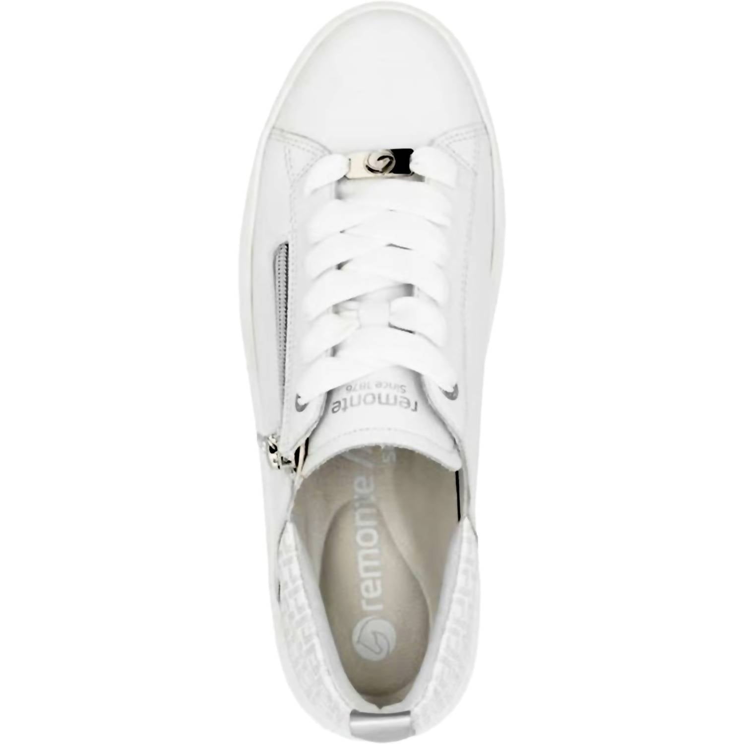 Elevate your style with the Women's Leather Sneakers by Remonte, featuring a chic white and silver leather design. These sneakers provide a comfortable medium width with extra room for wider feet, ensuring optimal freedom of movement for your toes. Crafted with a genuine leather upper, they boast exceptional breathability and weather resistance. Perfect for spring travel or holiday outings, these flat heel sneakers include a removable cushioned insole and a flexible ultralite Lite-n-Soft outsole for all-day comfort.