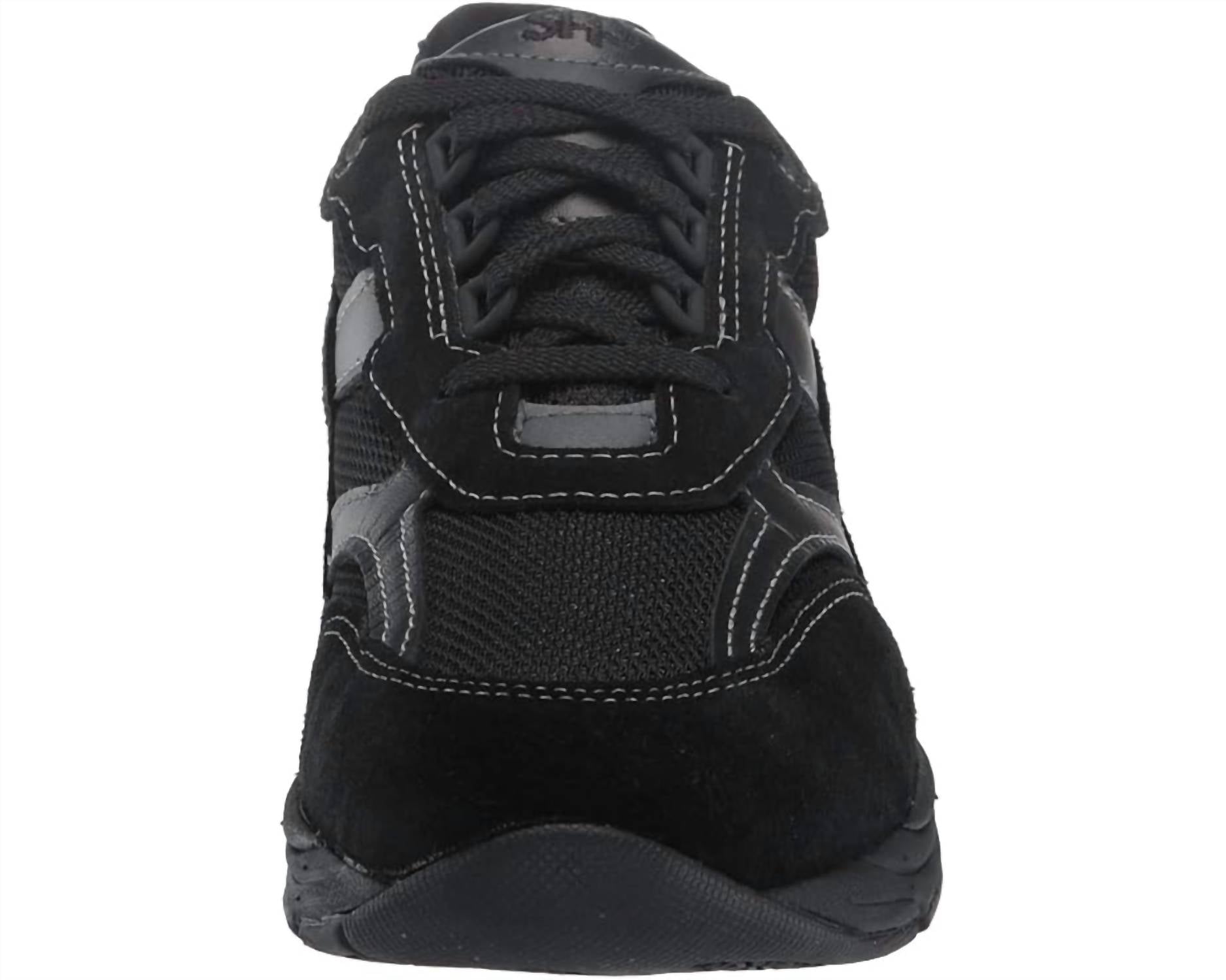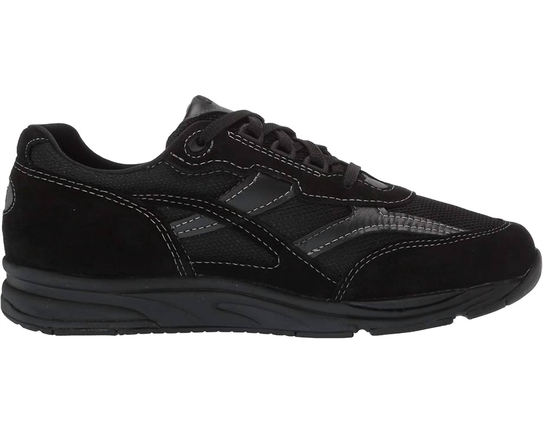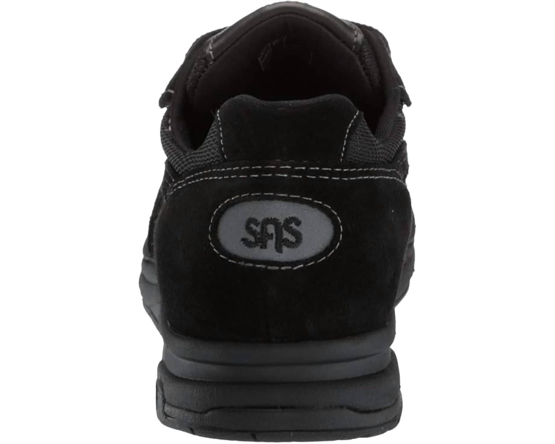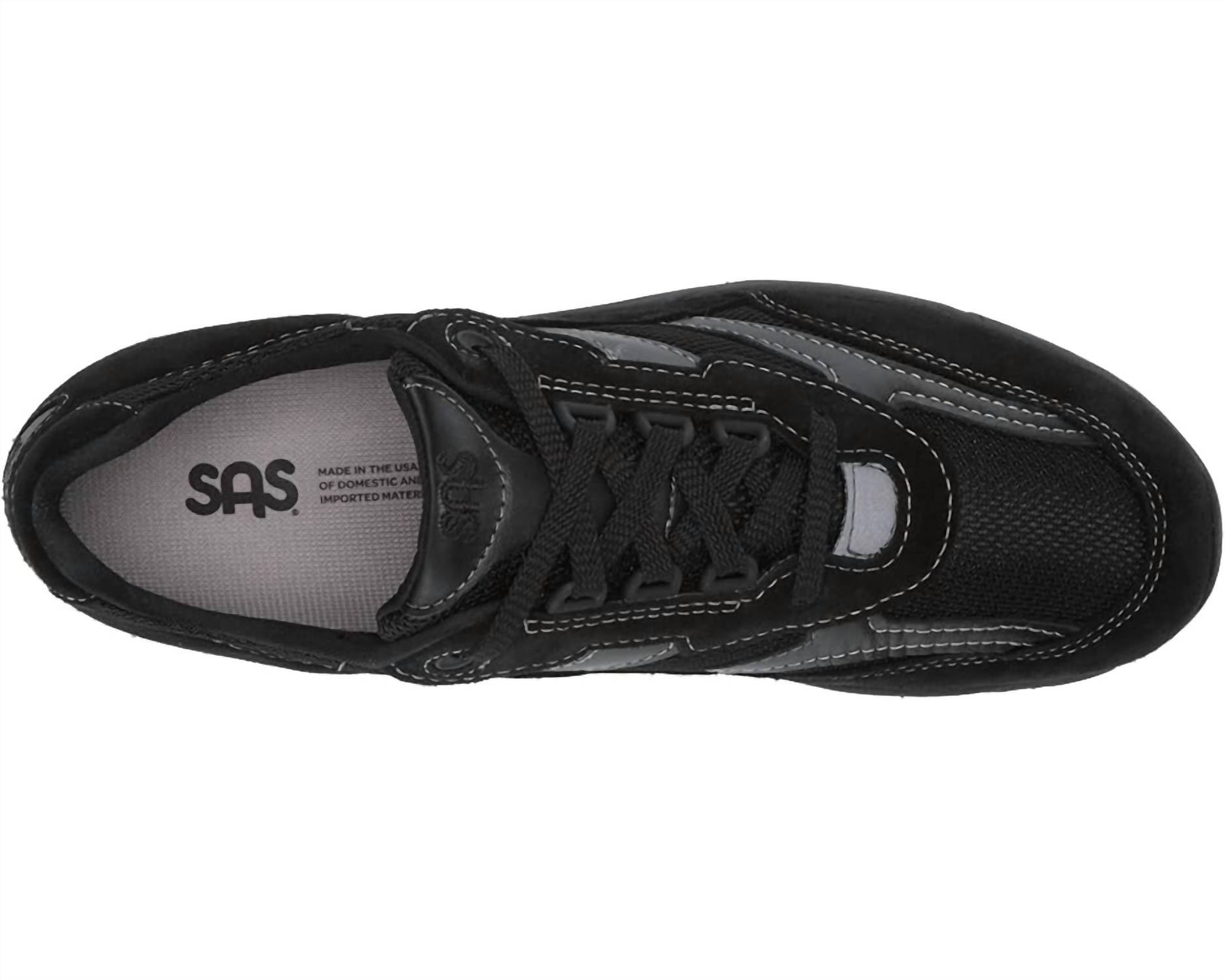 Cute, functional, and comfortable. These sneakers check all the boxes. Embrace the weekend with the Women's Tour Mesh Comfort Walking Sneaker by SAS, perfectly designed for athleisure and fitness activities. This black/silver sneaker features a round toe with uppers crafted from a combination of genuine leather and breathable mesh for maximum comfort. Originating from the U.S.A, it offers a traditional lace-up closure and is equipped with a lightweight, shock-absorbing SAS SteadyTrac™ Midsole for added stability. Care instructions are not specified; however, it's approved for Medicare, diabetic needs, and built for all-day support with its CoolSTEP Footbed and Comfort Outsole. Dimensions for size 8: Heel Height: 1 inch, Weight: 10 oz.