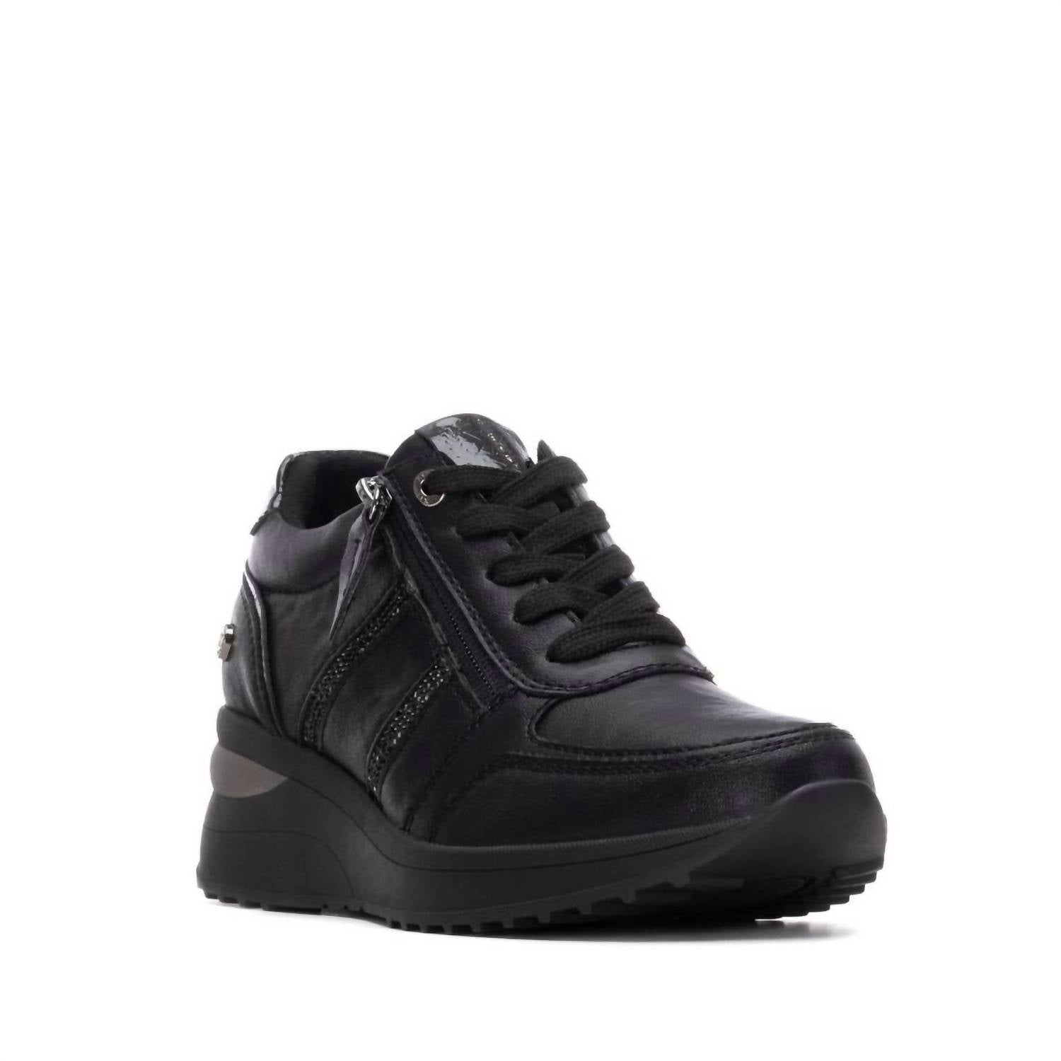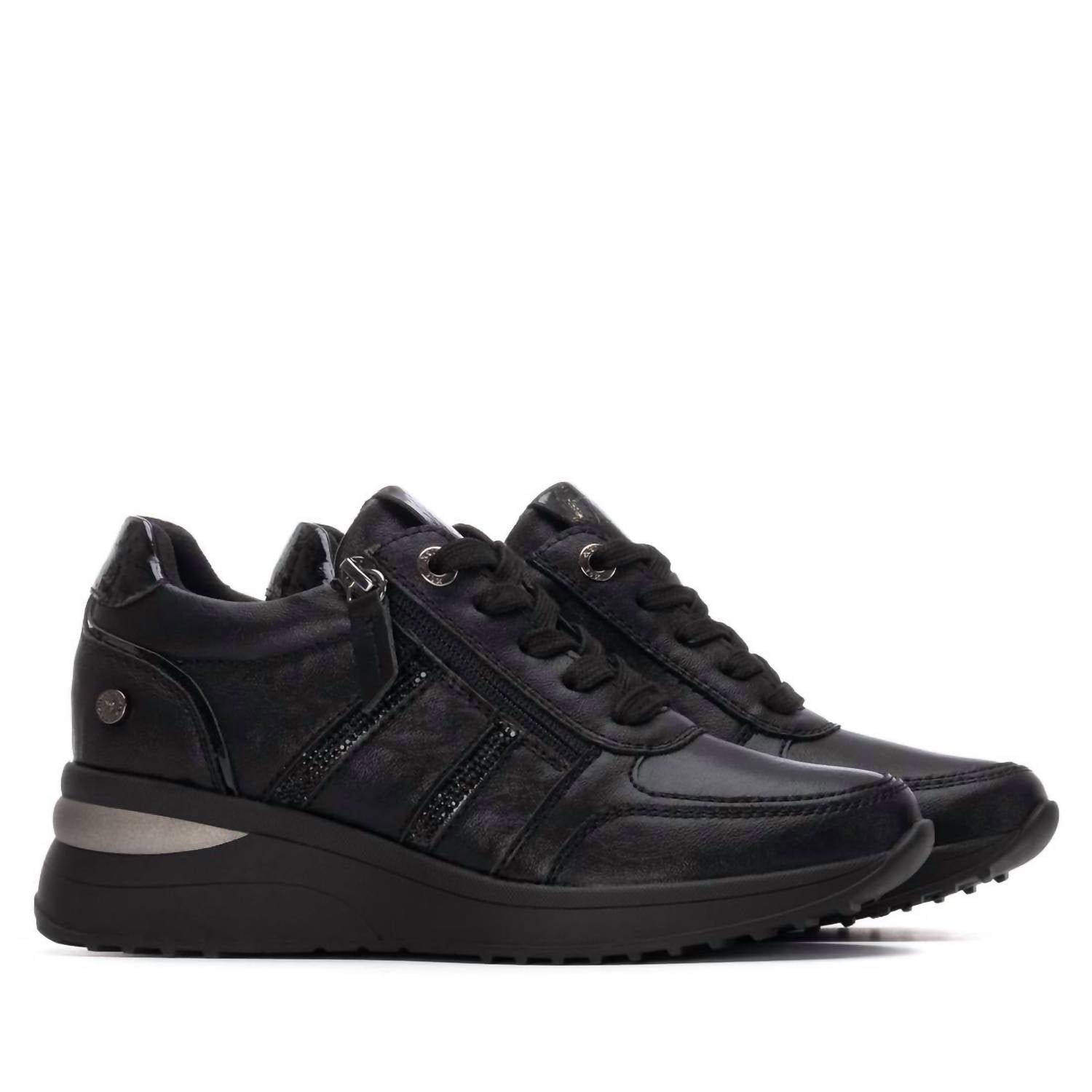 Get your daily steps in with these adorable sneakers. Elevate your athleisure wardrobe with the Women's 144407 Round Toe Sneakers by Xti, crafted to offer both style and comfort. Featuring a sleek black design, these sneakers cater to women's medium shoe width and flaunt a flat heel for effortless wear. Ideal for fitness or workout sessions, the round toe shape ensures a comfortable fit during your spring activities. Embrace quality craftsmanship with these versatile sneakers, perfect for any casual or special occasion.