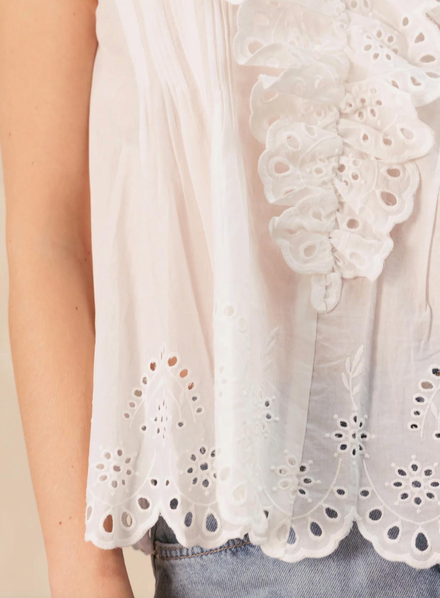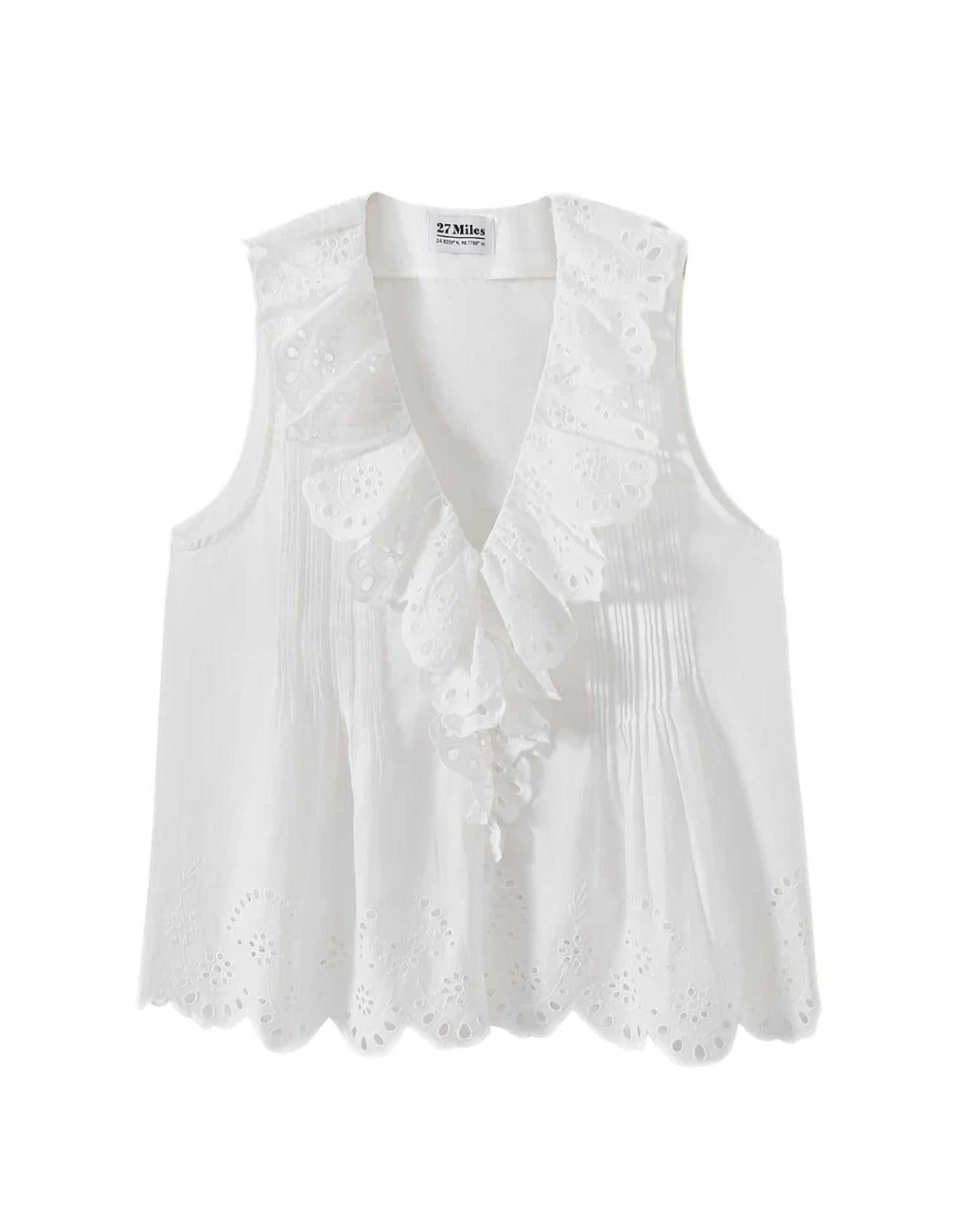Experience the effortless style of the Odina Loose-fitting Tank by 27 Miles Malibu, a sleeveless essential crafted from soft cotton voile. Designed for ultimate comfort in cloud, this tank showcases a scoopneck adorned with delicate eyelet-embroidered ruffles, embracing a boho chic trend. Origin: Not specified. Closure: Pull-on. Care: Hand wash. Perfect for summer vacations.
