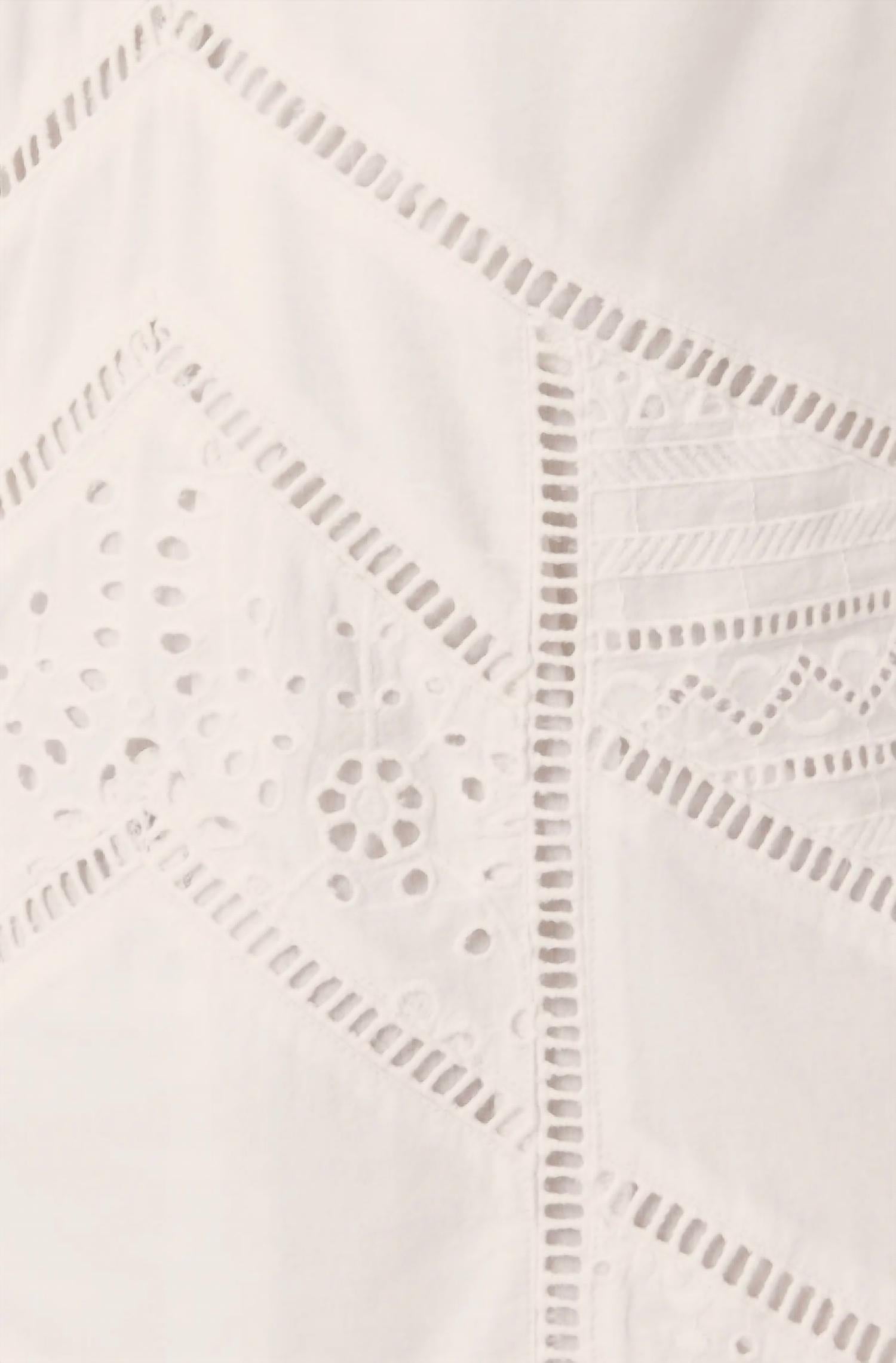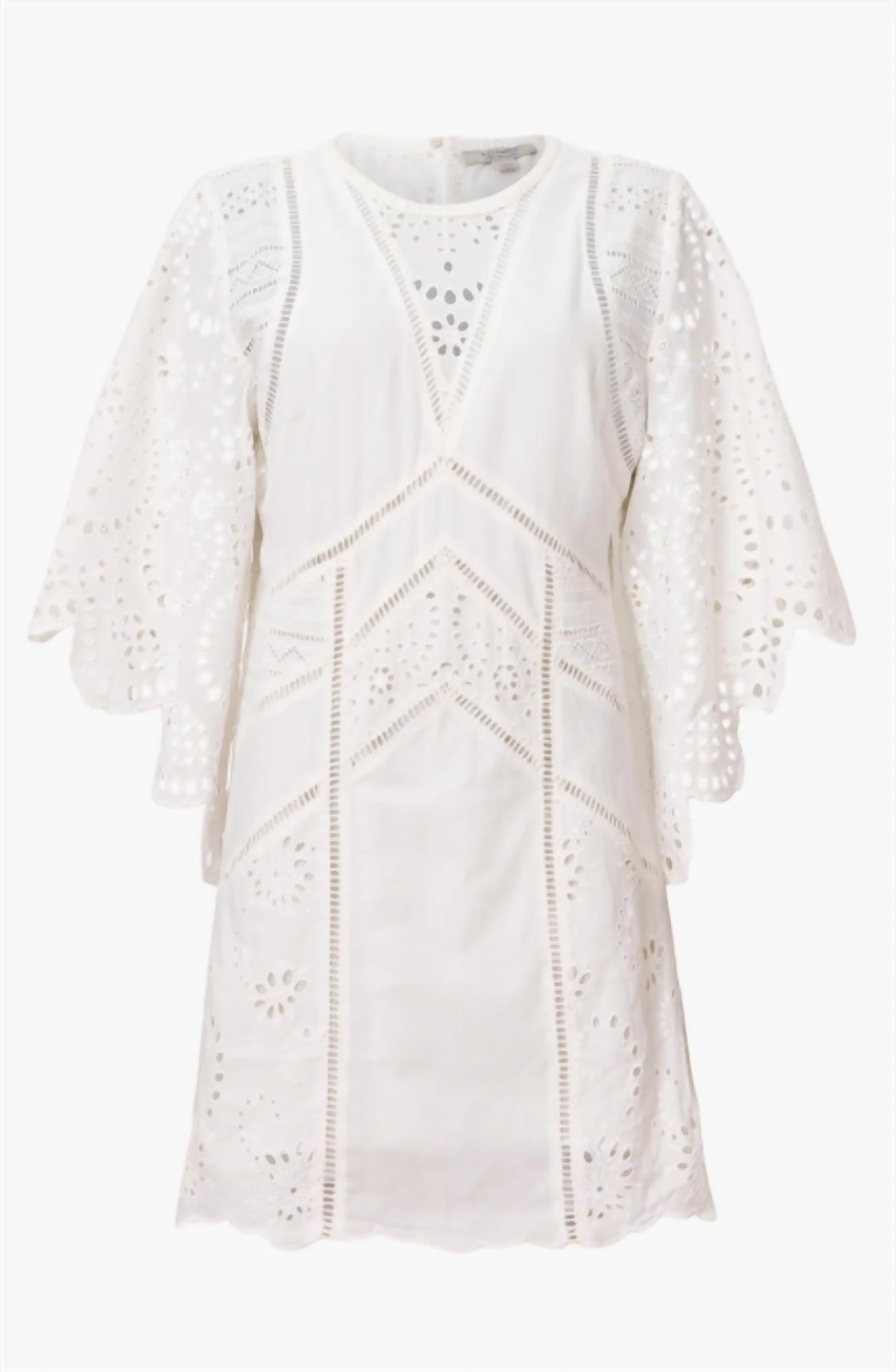 Intricate eyelet embroidery, lattice insets and scalloped trim bring gorgeous texture to this crisp cotton minidress framed fly flowy, semisheer sleeves.